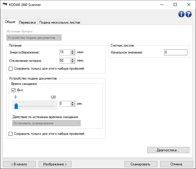 Отдельной кнопки Power нет, ее заменяет крышка-лоток: когда она откидывается, сканер включается, а сразу после закрытия крышки выключается. Если сканер с откинутым в рабочее положение лотком бездействует 15 минут, то он перейдет в режим энергосбережения — подсветка кнопки сканирования начнет мигать зеленым, а через 60 минут отключится (эти значения можно менять). Чтобы вновь включить его, надо закрыть и вновь открыть лоток либо нажать кнопку прокрутки.