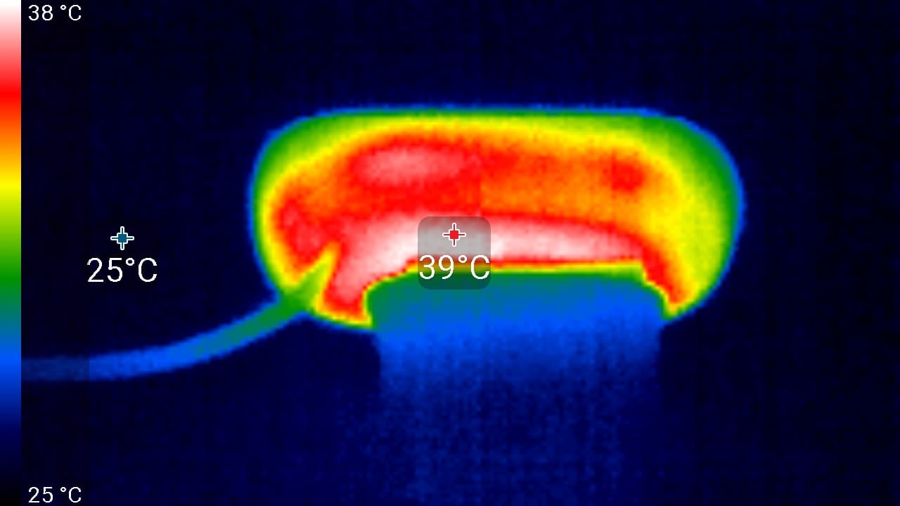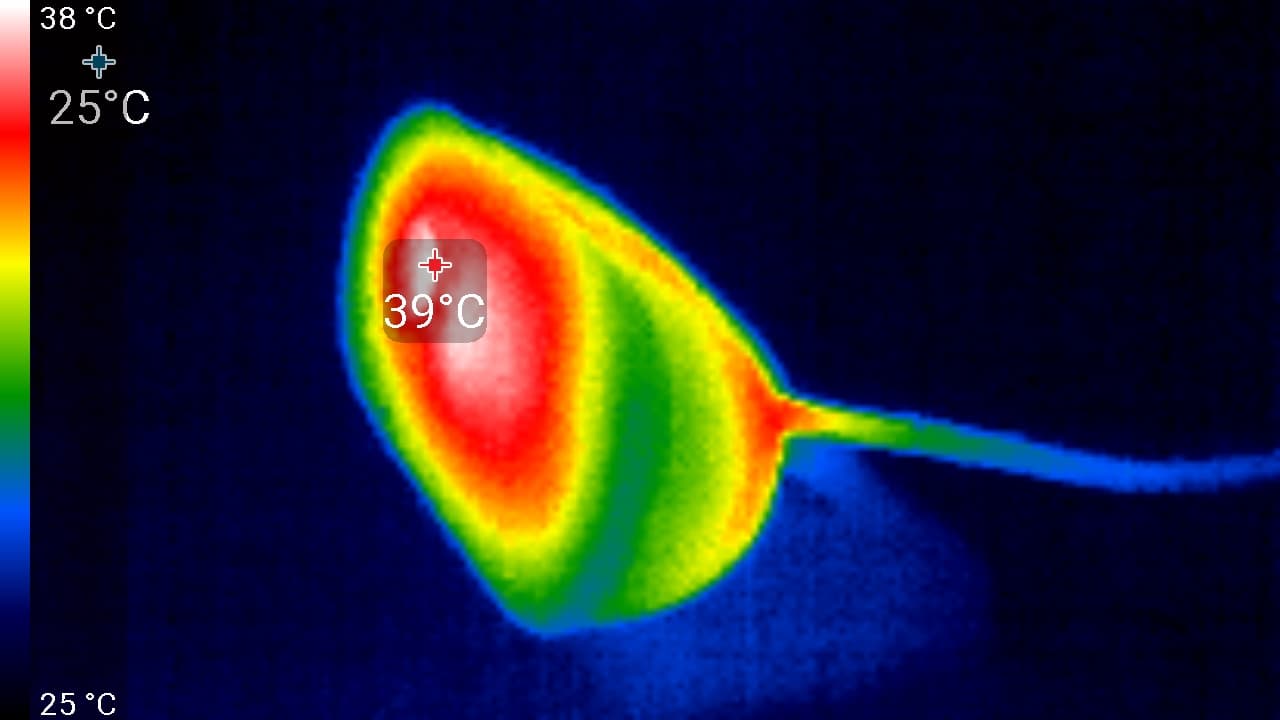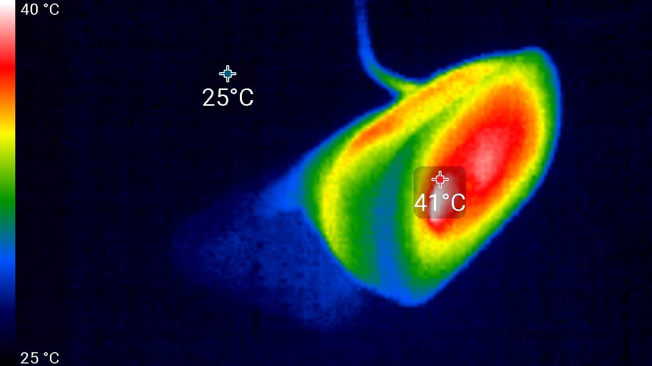 Последнее, о чем следует беспокоиться — это нагрев столь несложного прибора. Некрупный сенсор, экономичная скромная электроника — чему там нагреваться? Посмотрим. Сфотографируем камеру тепловизором после часа ее беспрерывной работы.