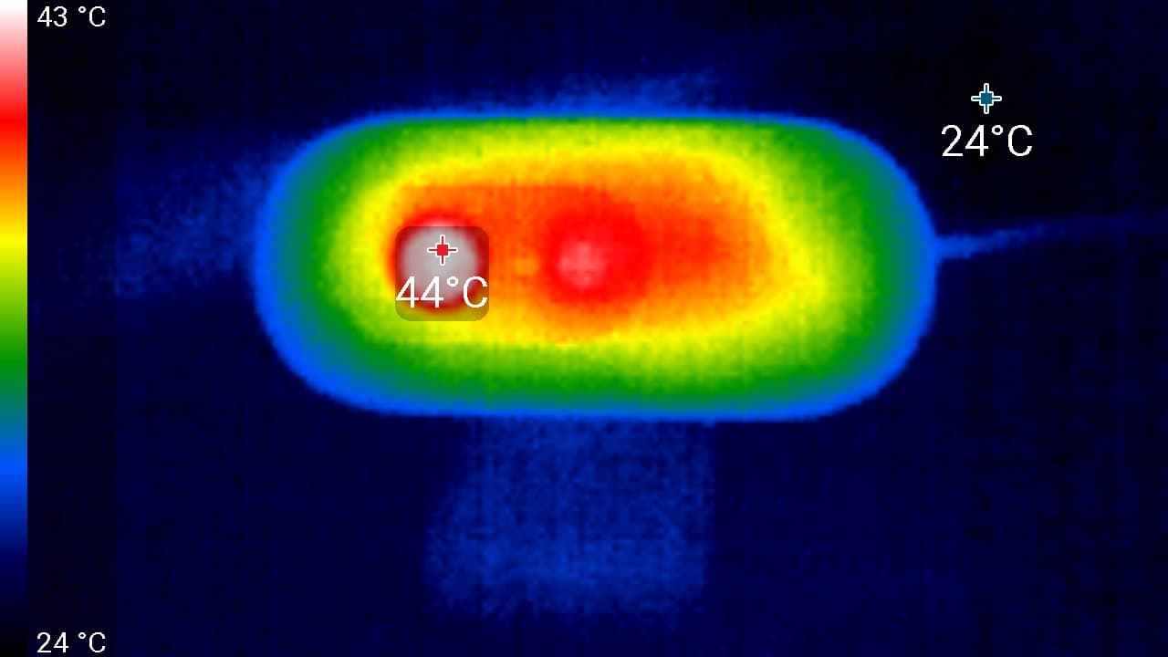 Максимальная температура корпуса (44 °C) наблюдается только на одном участке, точно в стекле объектива. Но тут подвох: стекло отражает не только видимый свет, поэтому правильнее будет судить по другим снимкам, в которых нет отражающих поверхностей. Из остальных частей корпуса нагрев выше в правой части задней панели. По всей видимости, здесь расположен процессор, обрабатывающий видеопоток и отвечающий за прочие операции, производимые камерой. Такая температура не опасна для современной электроники, хотя в руководстве пользователя имеется предупреждение о возможном перегреве устройства.