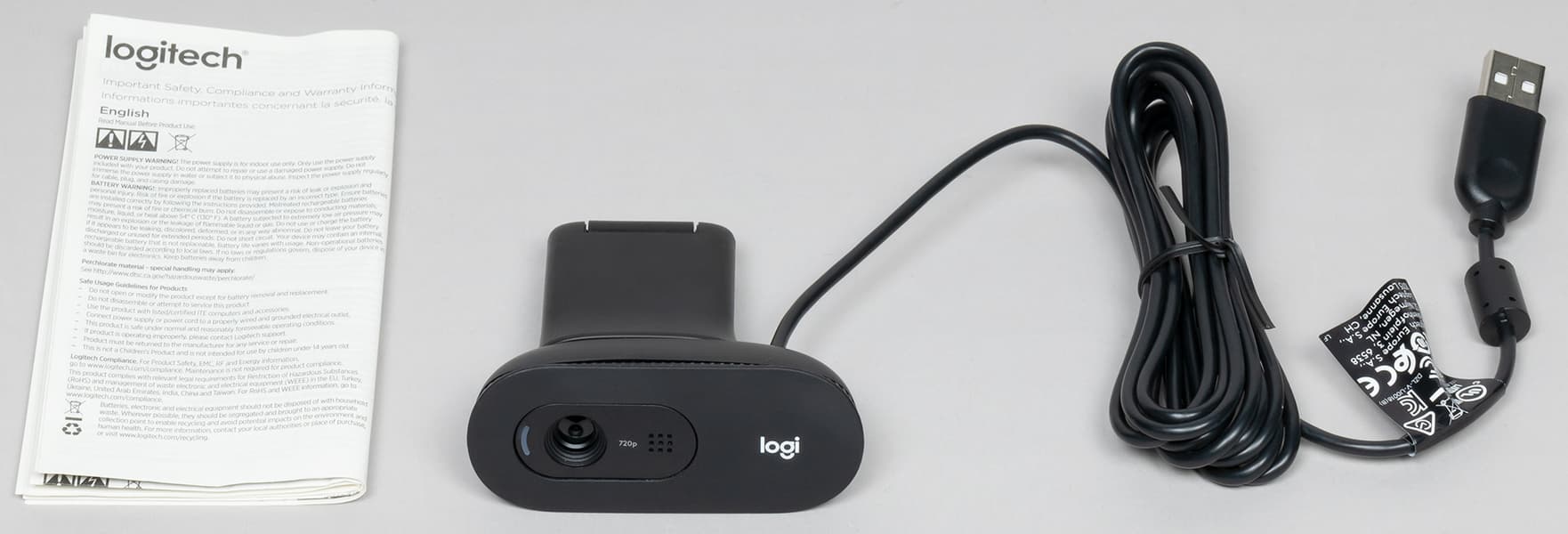 Камера комплектуется... Да ничем она не комплектуется. Кроме многократно сложенных мультиязычных листовок с информацией о мерах безопасности и гарантиях. Зато кабель у Logitech C505e — длинный, не в пример дешевым «любительским» веб-камерам. Целых два метра.