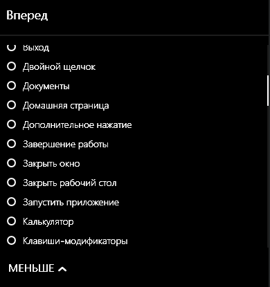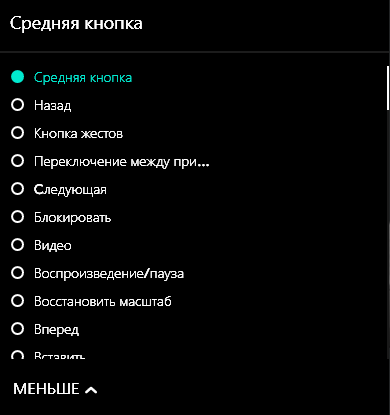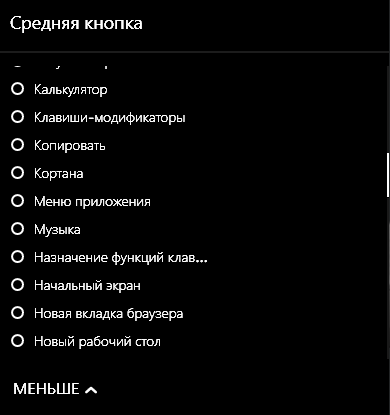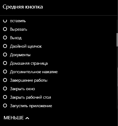 Есть, конечно, и более полезные. Например, можно задать функции, выполняемые по нажатию колесика или кнопок быстрого доступа — для этого нужно в окне программы кликнуть по кружку возле этих элементов. Список возможных вариантов впечатляет, вот лишь часть списка вариантов для нажатия колесика: