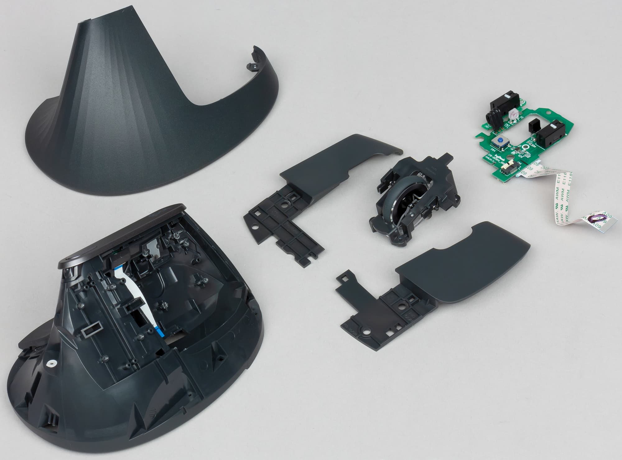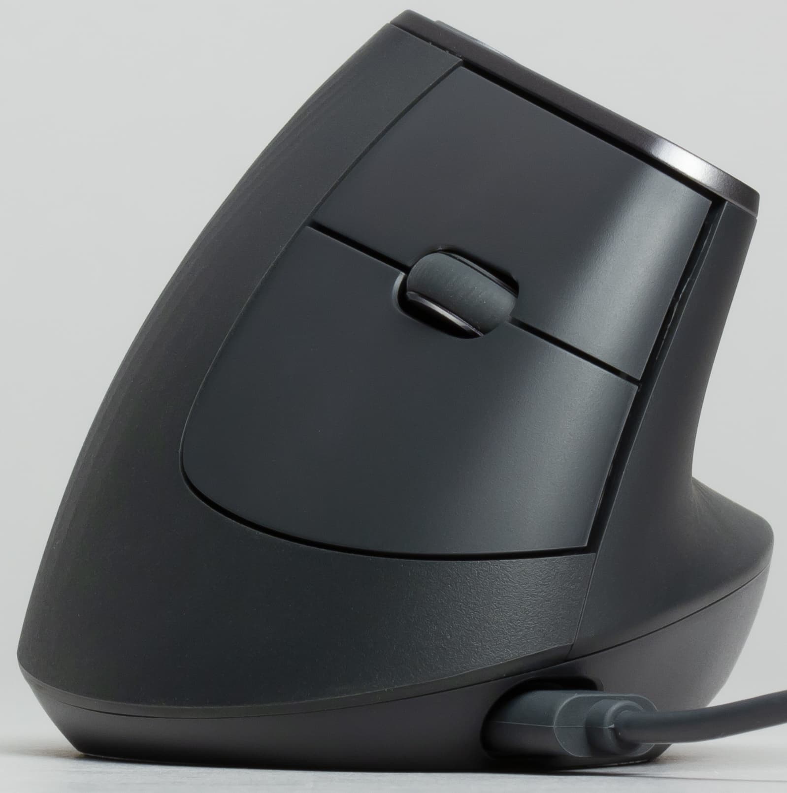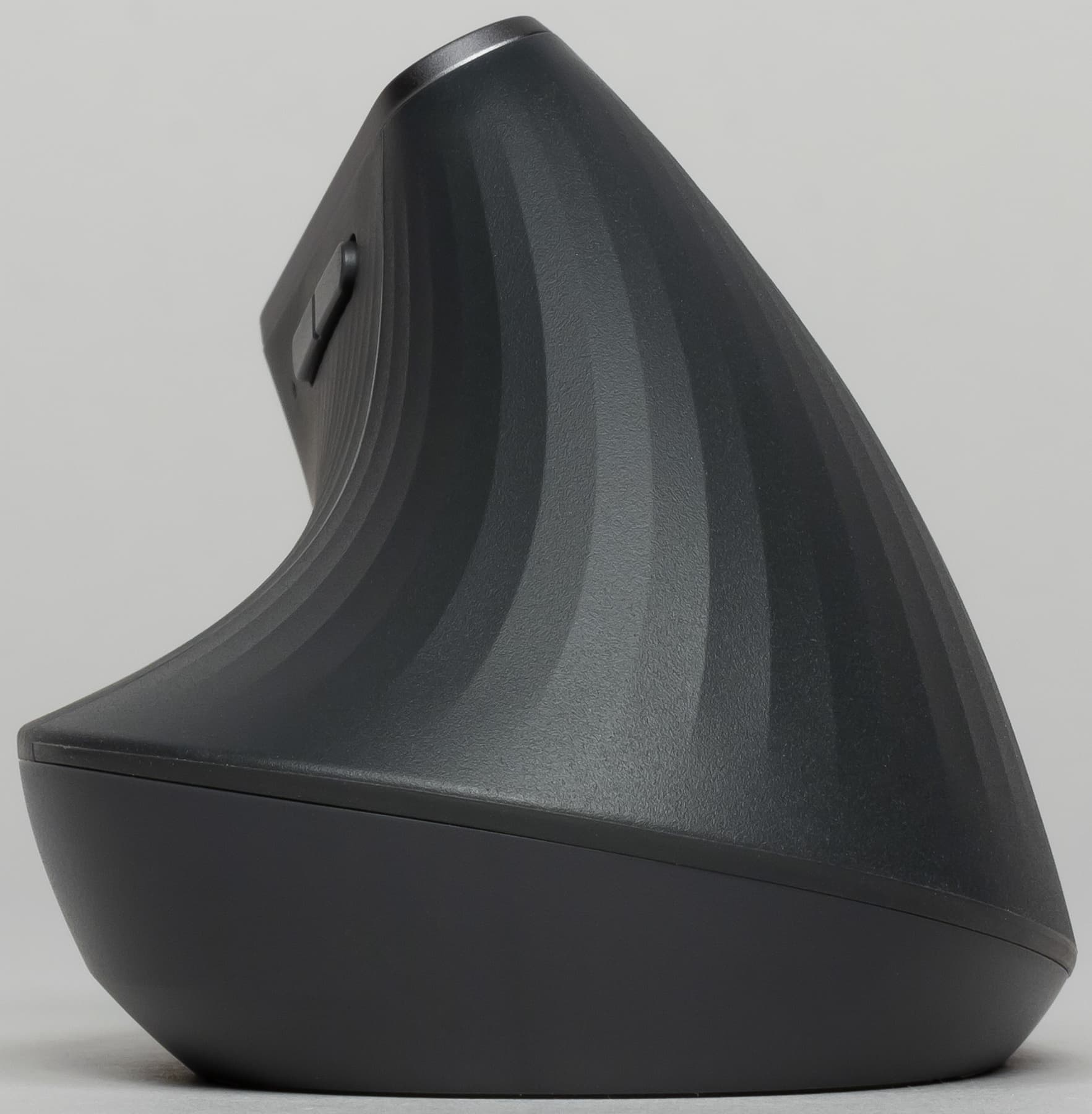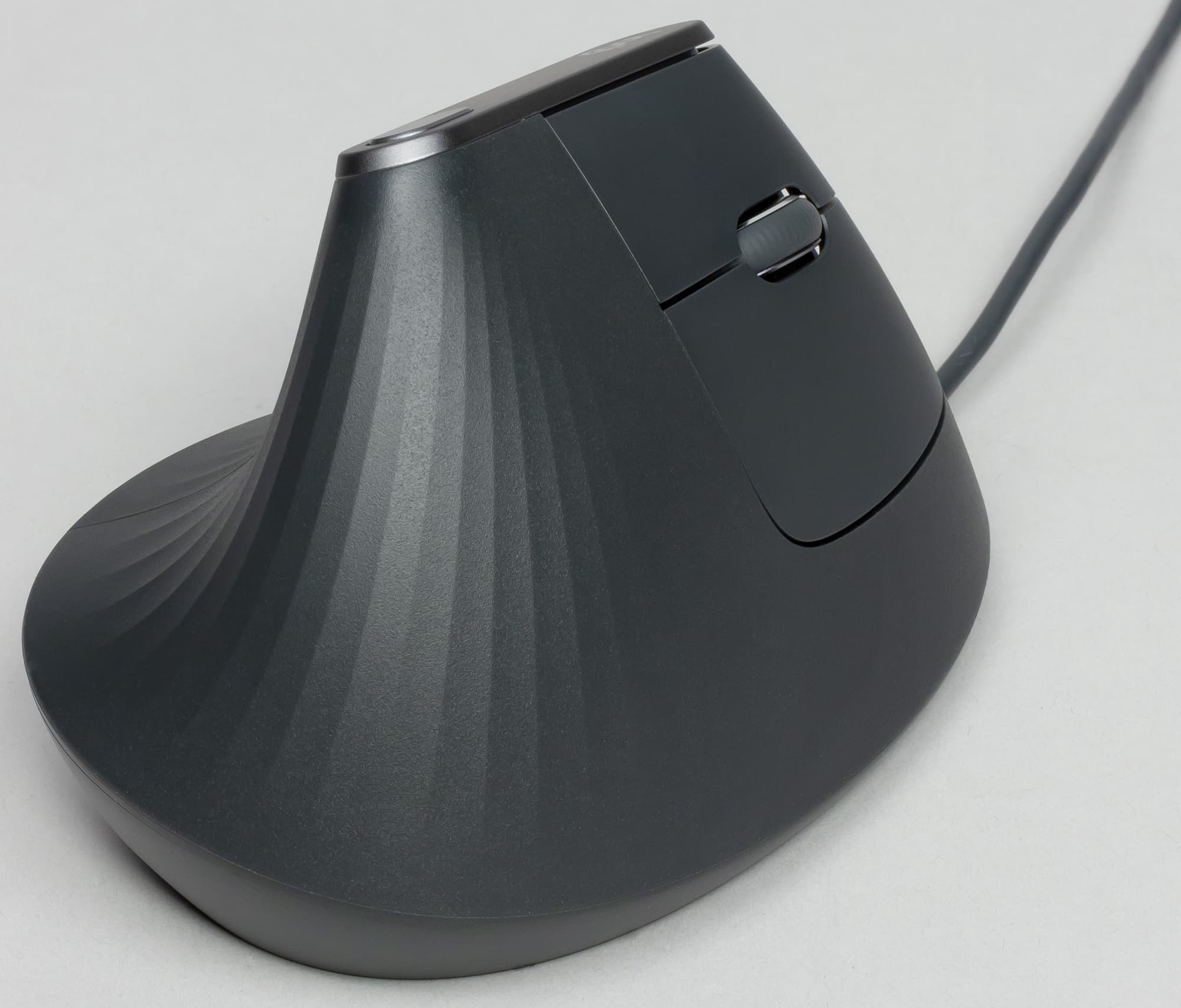 У корпуса можно выделить два компонента: горизонтальное основание и выступающую вверх наклонную часть, на которой и расположены левая-правая кнопки с колесиком между ними. Ее угол наклона по отношению к горизонтали, как сказано в официальном описании, составляет 57°. Очевидно, эта величина оптимальна с точки зрения эргономики — точный замер осуществить сложно, но примерно тот же наклон имеется и в других побывавших ранее и имеющихся сейчас у автора вертикальных мышах.