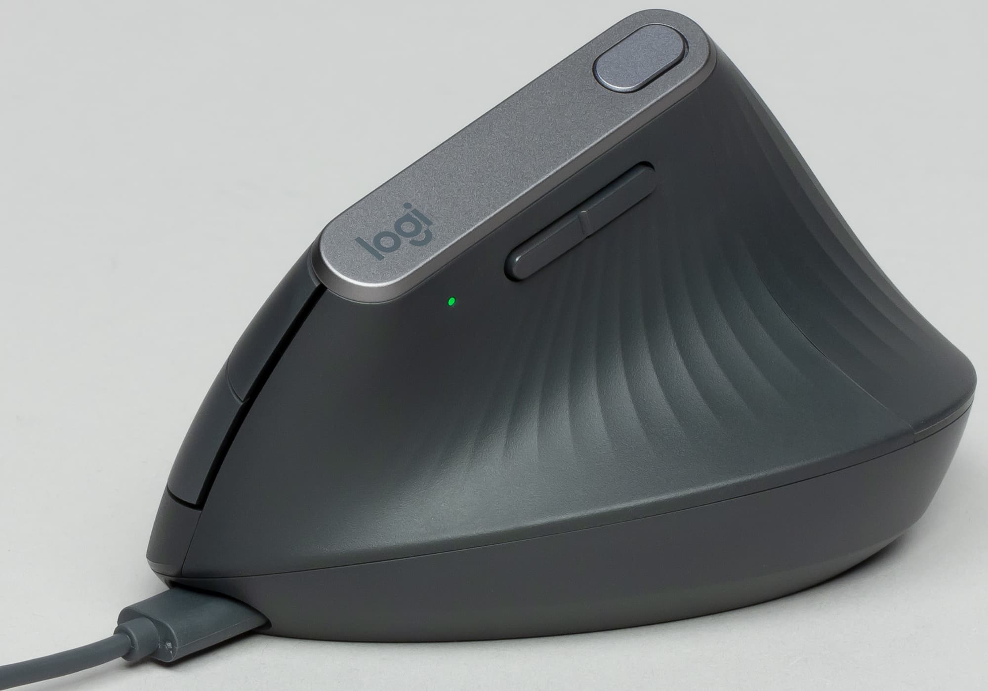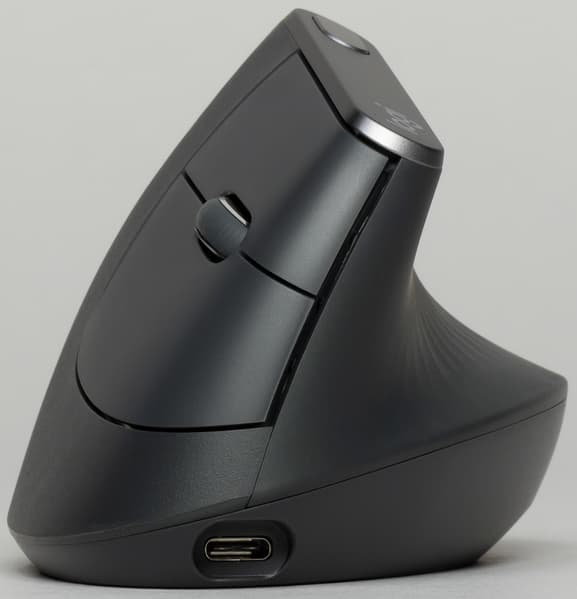 Logitech MX Vertical имеет встроенный аккумулятор, который можно заряжать как от USB-порта компьютера, так и от любого пятивольтового адаптера с разъемом USB A female или коннектором Type-C male. При необходимости (всякое бывает!) аккумулятор без особых проблем можно будет заменить.