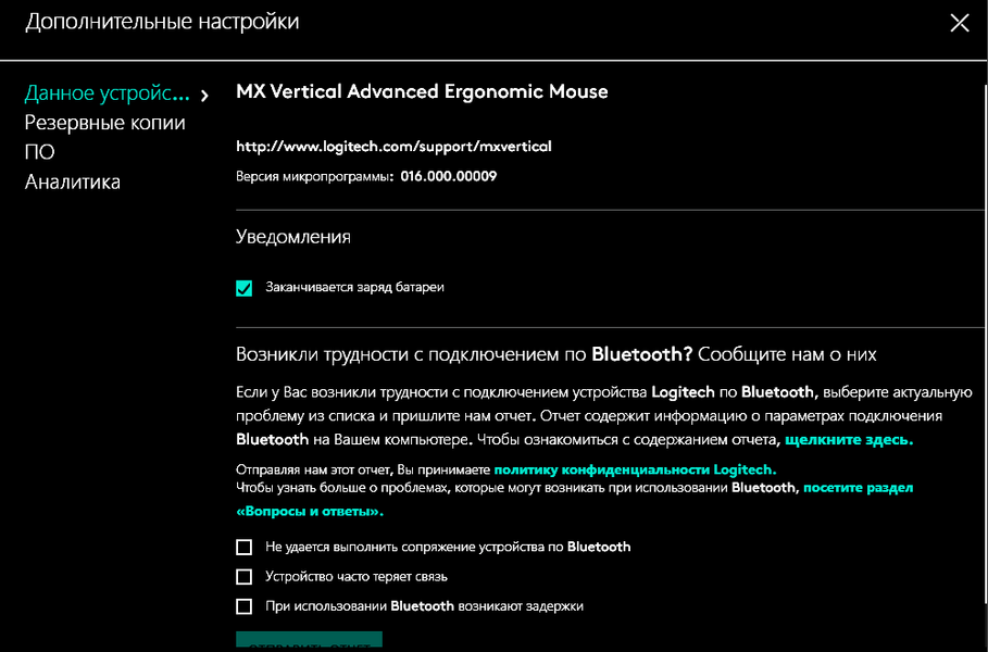 Нажатием кнопки «Больше» в окне программы переходим к экранам с дополнительными настройками, включая уведомления. Для них выбор единственный: о низком уровне заряда батареи; естественно, это имеет смысл при беспроводном подключении, и при желании его можно отключить. Также можно отключить автоматическую проверку наличия новых версий ПО.