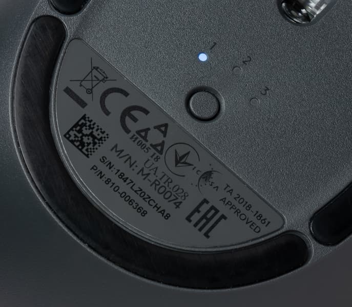 А дальше нужно выбрать канал подключения кнопкой Easy-Switch, которая находится на подошве мыши (круглая, рядом с ней три светодиода с номерами).