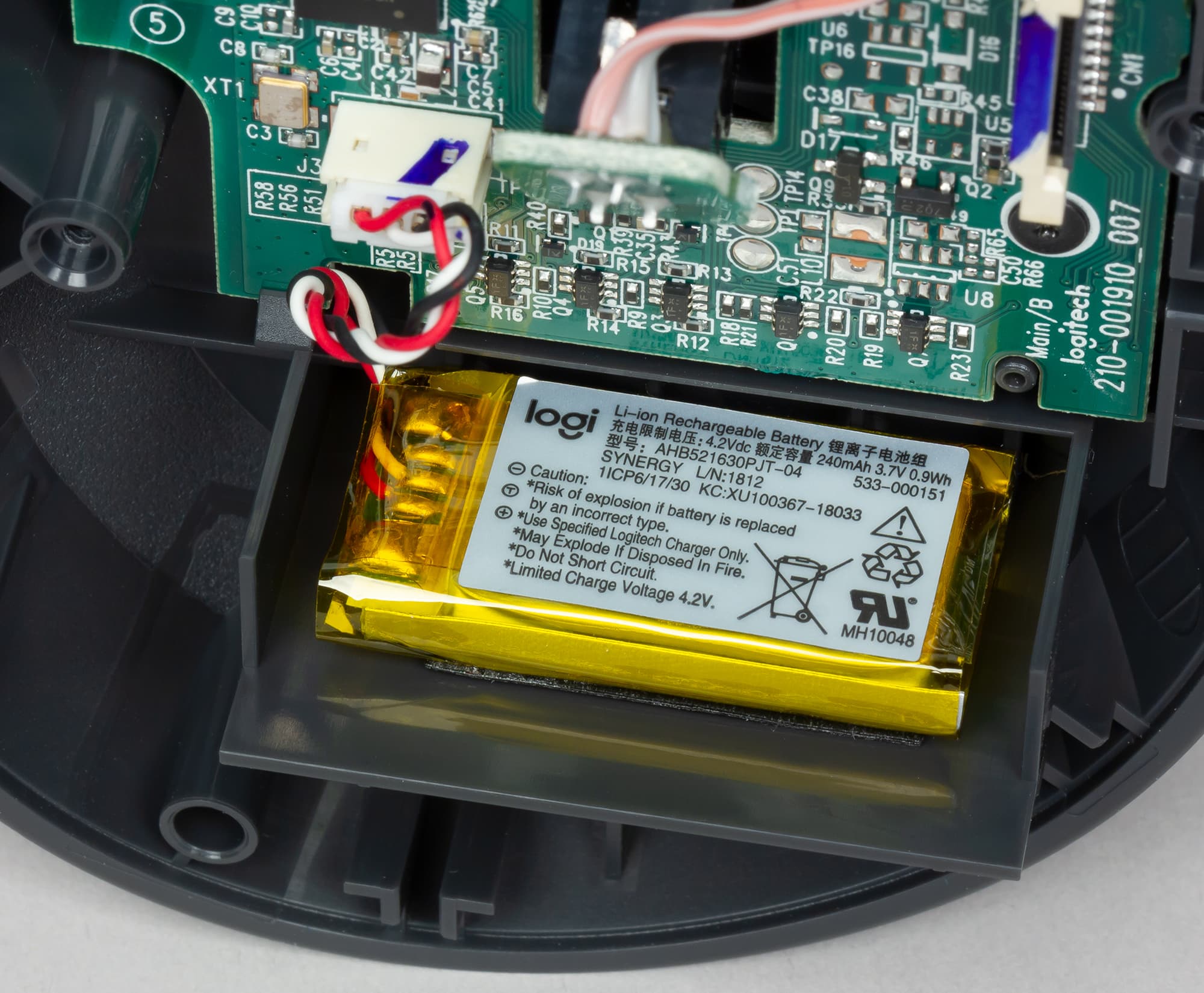 В мыши используется аккумулятор AHB521630 с номинальным напряжением 3,7 В и емкостью 240 мА·ч (0,9 Вт·ч), такой же можно встретить в прочих беспроводных изделиях компании Logitech и других производителей. В продаже доступны аналогичные аккумуляторы с таким же разъемом, то есть проблем с заменой не будет.