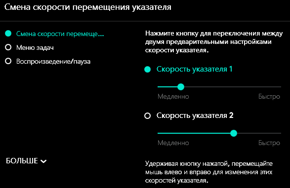 По умолчанию верхняя кнопка имеет функцию смены скорости перемещения указателя (или регулировку чувствительности). Кратковременными нажатиями на нее можно быстро переключаться между двумя значениями, заданными в настройках: