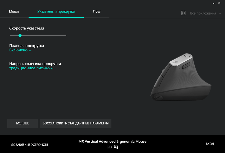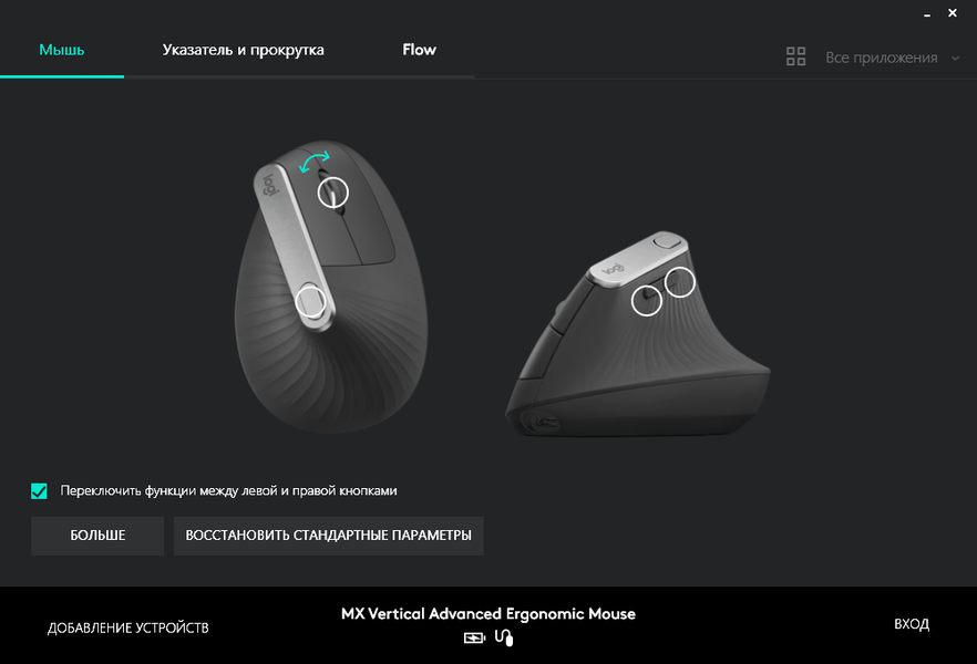Мы опробовали USB-подключение на компьютере с Windows 10. Мышь сразу была определена (в диспетчере устройств она значилась не как Logitech MX Vertical, а как HID-совместимая) и заработала без каких-либо дополнительных усилий. Индикатор в данном случае светится зеленым цветом.