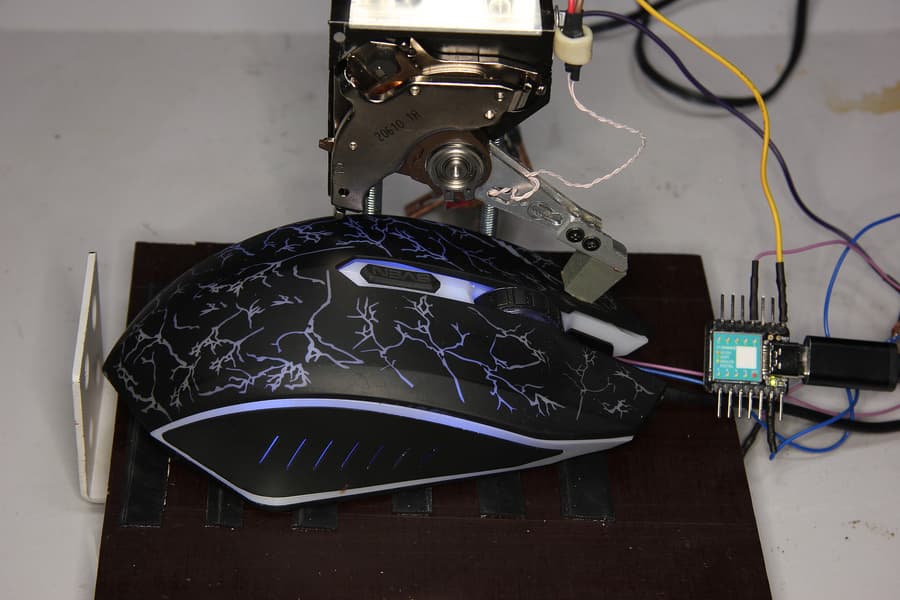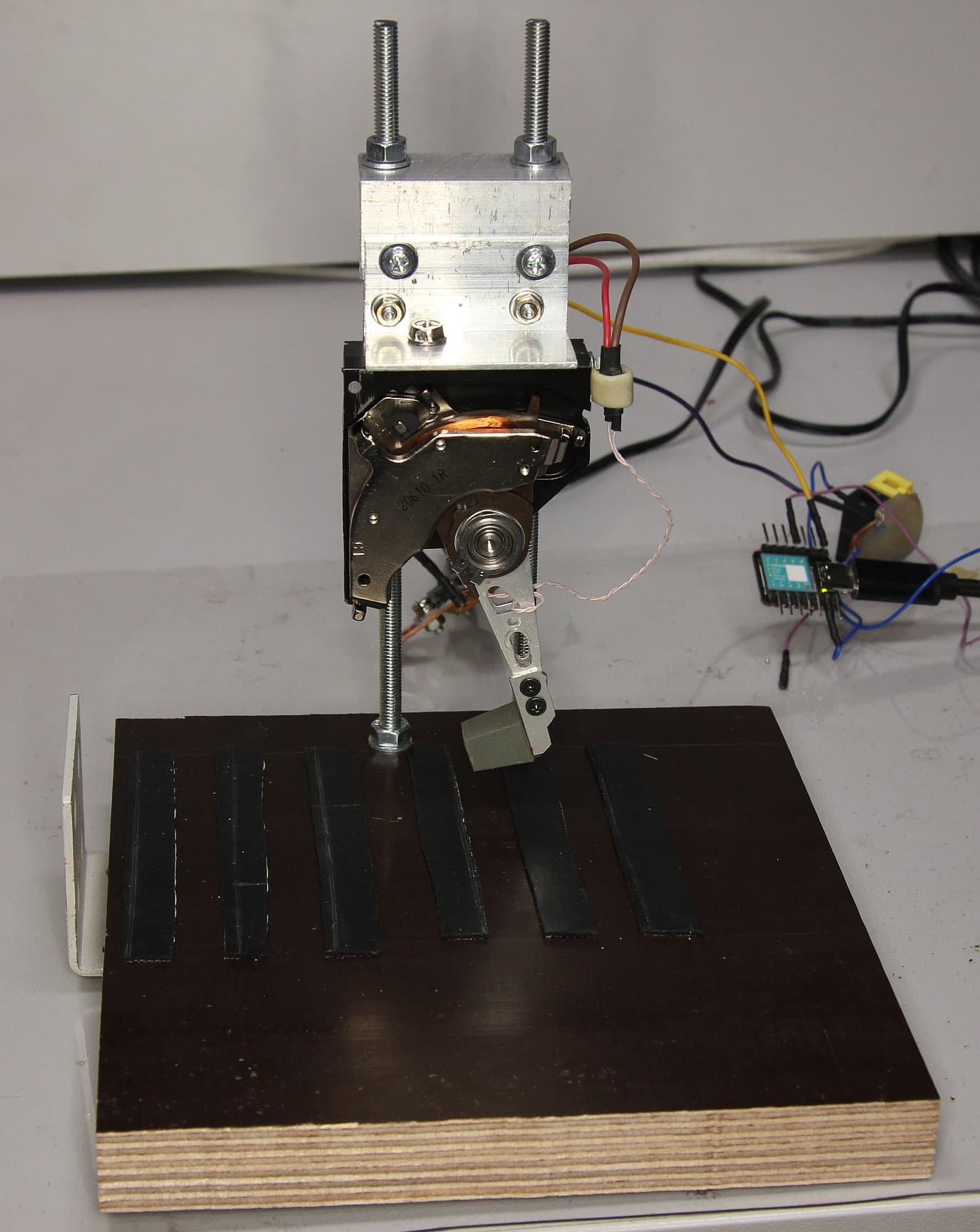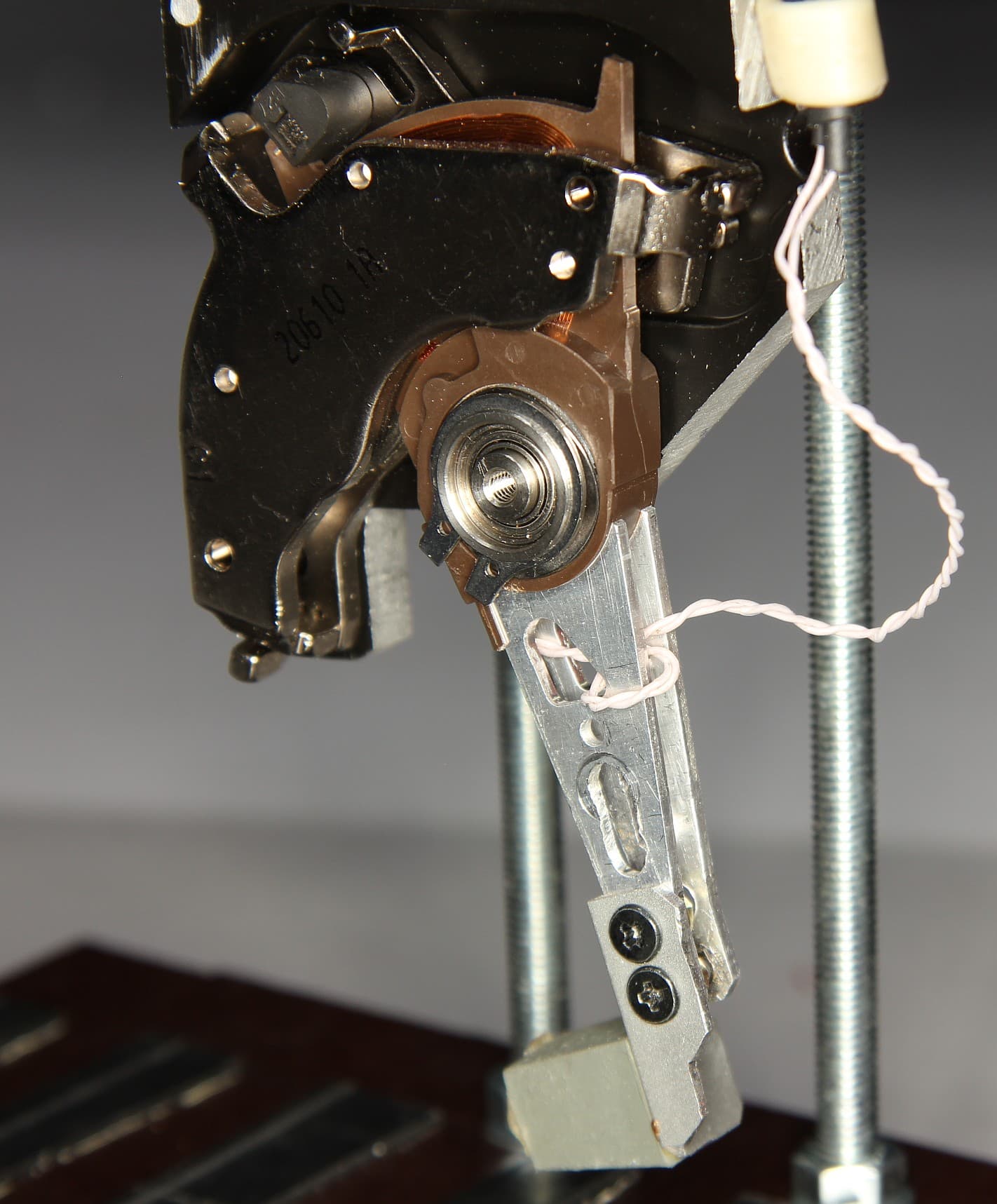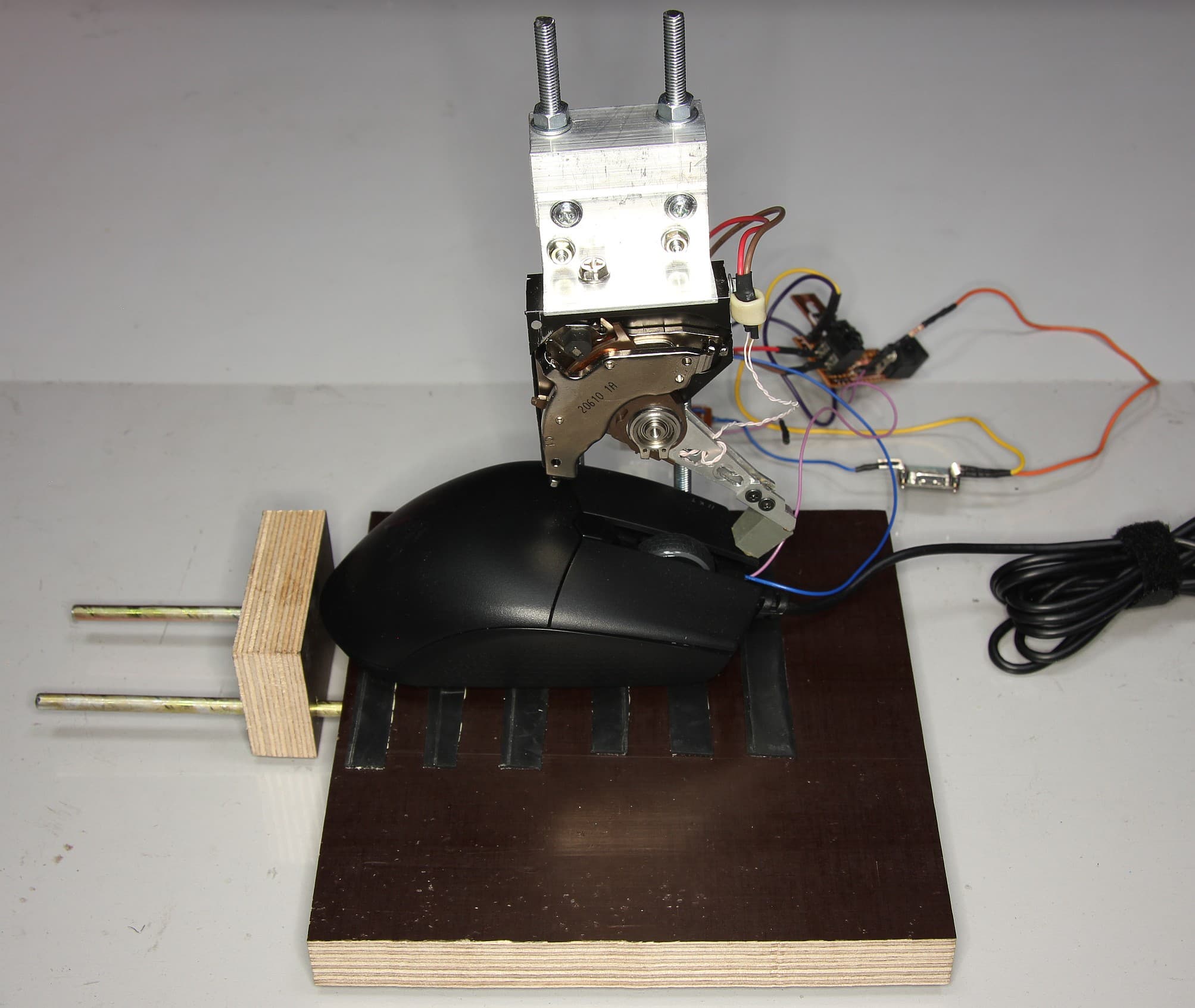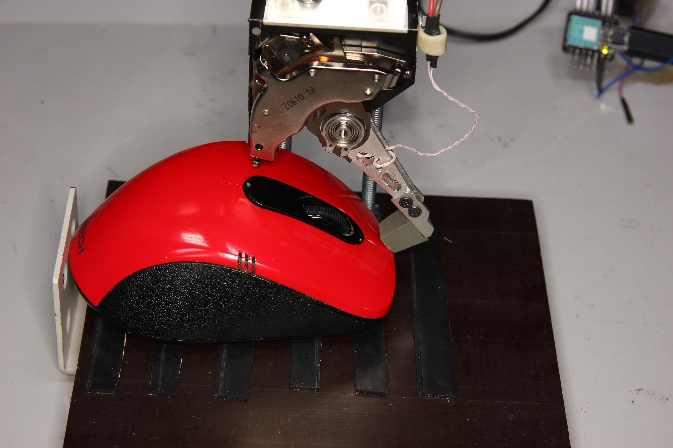 Однако нам показалось, что каждый раз разбирать мышь и подпаивать проводки — слишком затратно, так что этот этап мы решили исключить. Без разбора мыши (и без использования микрофона) остается единственный вариант — нажать на ее кнопку штатным образом, но сделав это по команде с минимальной задержкой. Человеку такую функцию доверить нельзя, поэтому на помощь приходит механизированный палец. Одним из самых быстрых и доступных приводов, подходящих для выполнения такой задачи, является привод головок жесткого диска. На его основе и был изготовлен стенд с механизированным пальцем: