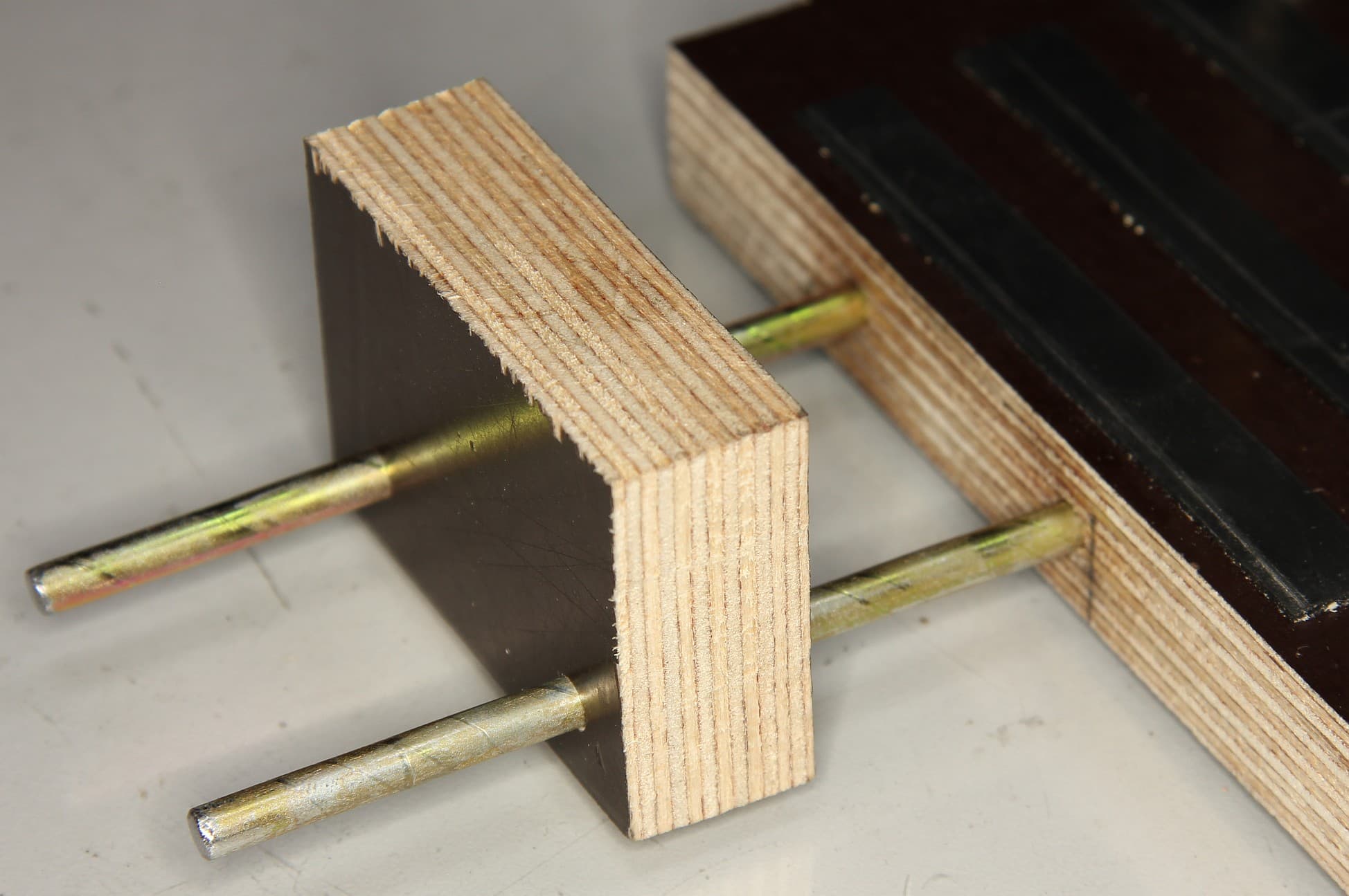 Через некоторое время конструкция упора была изменена так, чтобы даже в случае крупных мышек упор можно было отодвинуть достаточно далеко и боек опускался на край лепестка кнопки. Теперь упор — это деталь из фанеры, с усилием передвигаемая по стальным направляющим: