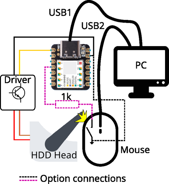 Подключение к контактам микропереключателя мыши в данном случае является необязательным, и используется только в том случае, если нужно определять задержку от передачи сигнала приводу (HDD Head) до замыкания контактов микропереключателя.