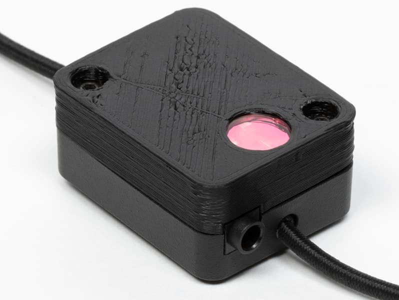 Сверху на датчике есть сигнальный светодиод и разъем для подключения кабеля от микропереключателя мыши. Снизу – окошко, за которым находится оптический датчик. С одного торца – разъем Micro-USB, с другого – микрофонный разъем миниджек 3,5 мм.
