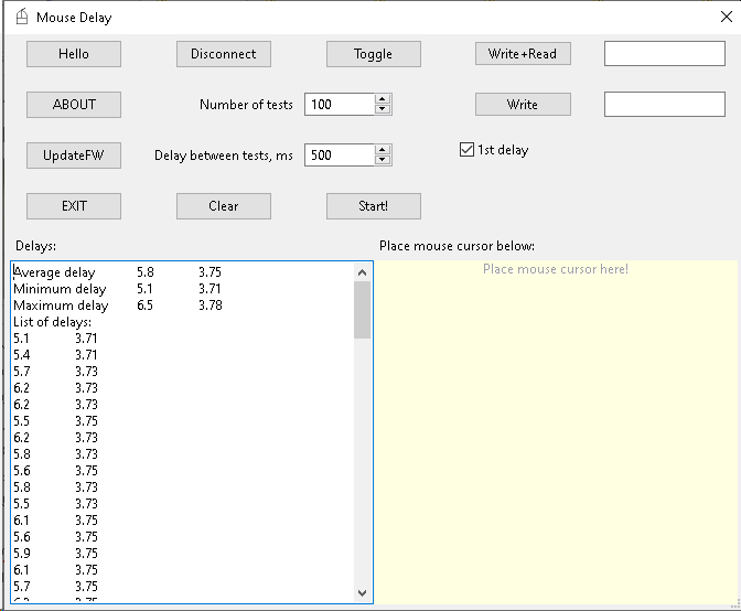 - В программе выбирается число тестов (обычно 100), задержка между тестами (500 мс достаточно, чтобы механический палец успокоился на кнопке мыши после нажатия и отпускания) и нужно ли выполнять измерение первой задержки.