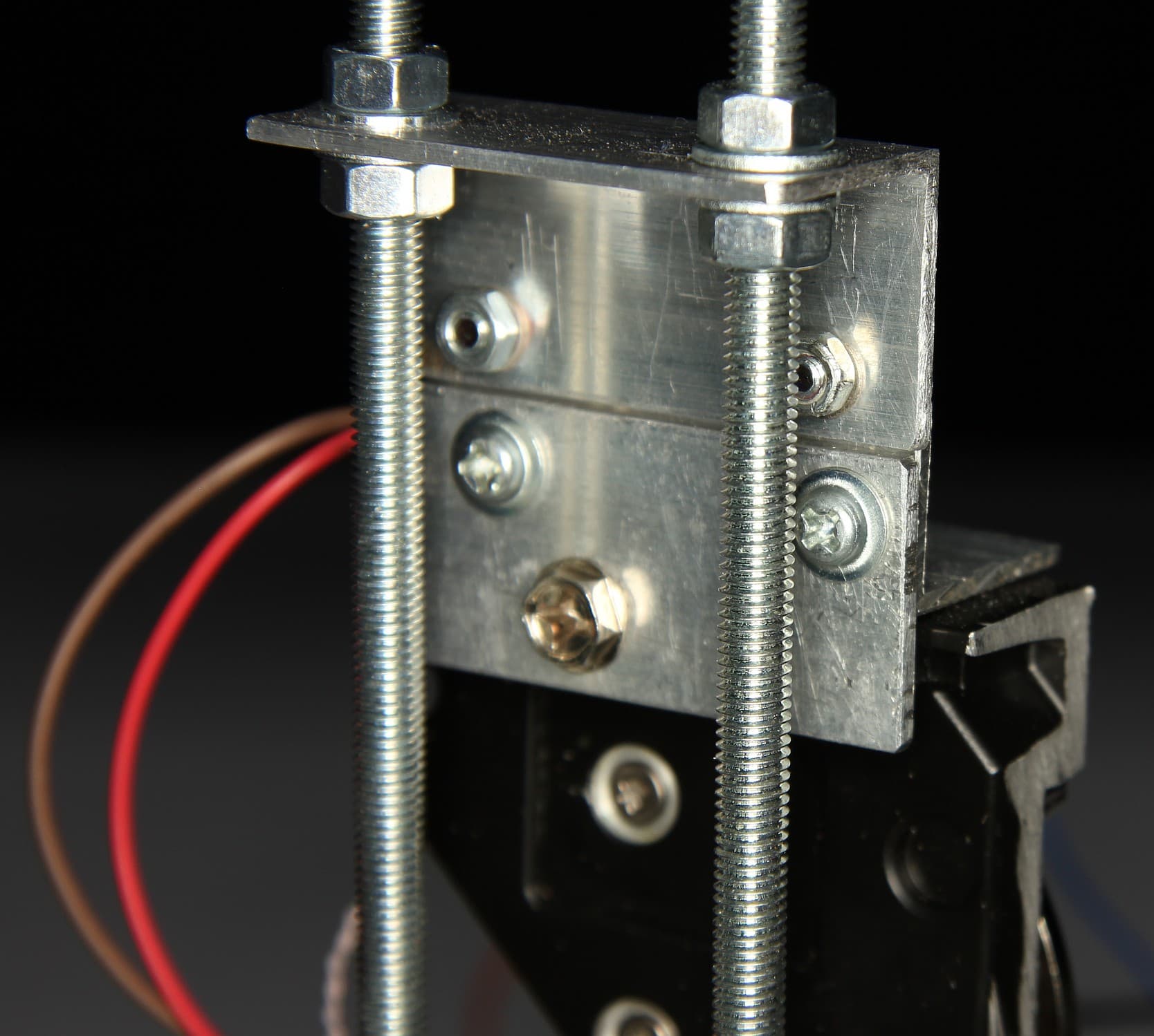 Привод головок с закрепленным резиновым бойком с помощью уголков фиксируется на резьбовых стойках, что позволяет тонко регулировать его высоту относительно мыши.
