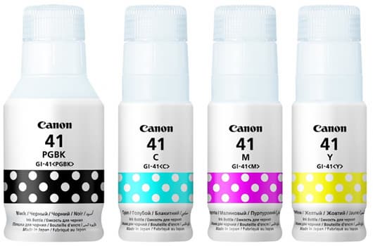 | Расходные материалы | Чернила чёрные GI-41 PGBK (135 мл, пигментные) Чернила цветные GI-41 C, M, Y (по 70 мл, на основе красителей) Картридж для обслуживания (абсорбер) MC-G02 | ||||