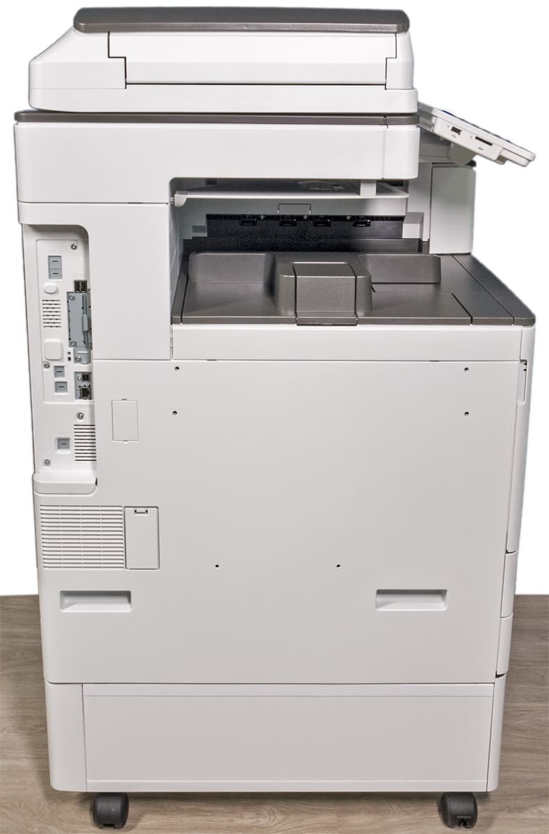 Штатных подающих лотков три. Два выдвижных находятся в нижней части базового блока, они вмещают по 550 листов. Таким образом, в каждый из них можно положить полную пачку бумаги, даже если ее плотность несколько выше обычных 80 г/м². Отличаются лотки предельным форматом: первый (верхний) до А4, второй (нижний) до А3/SRA3.