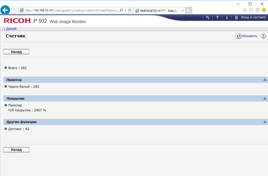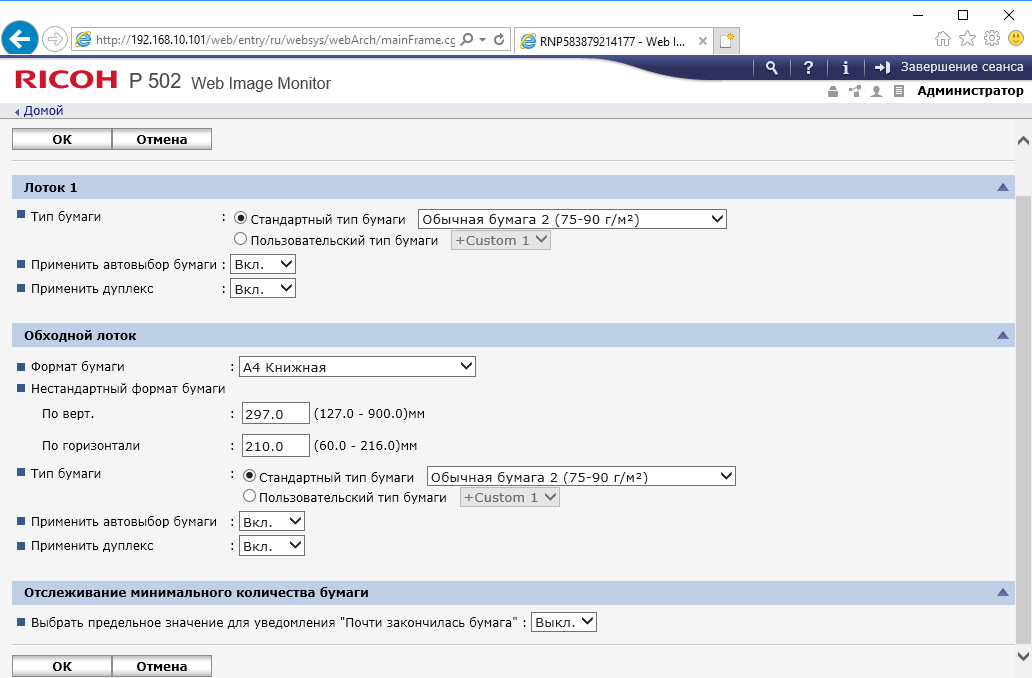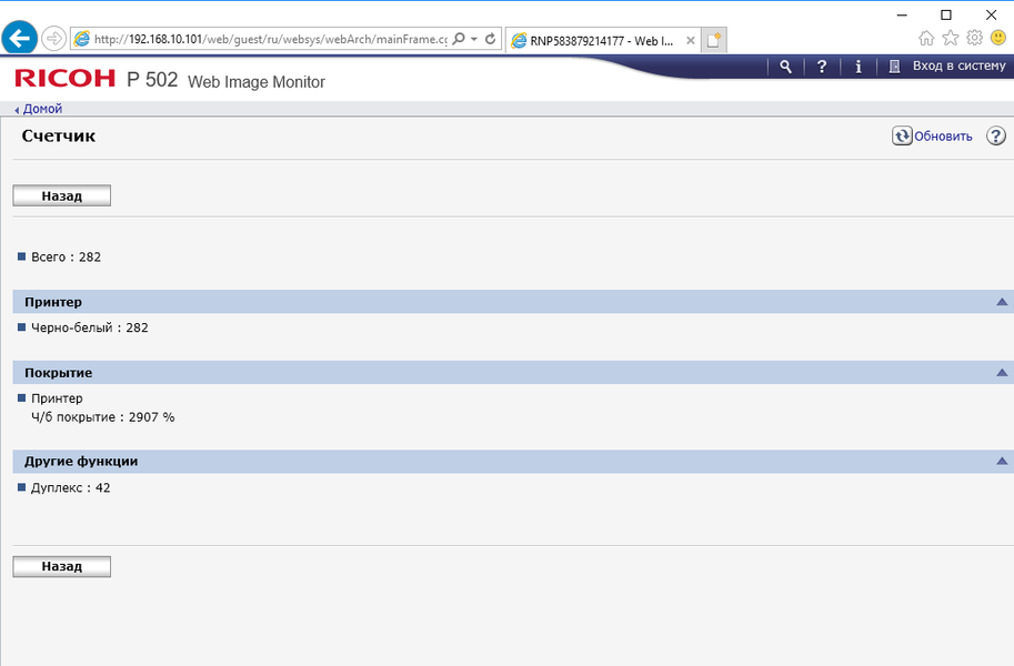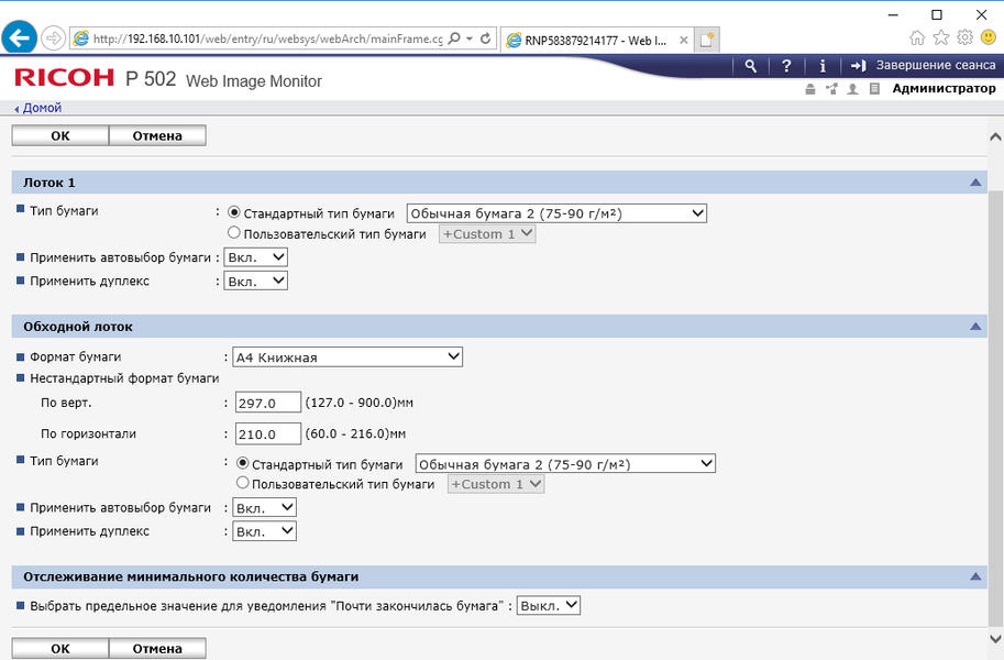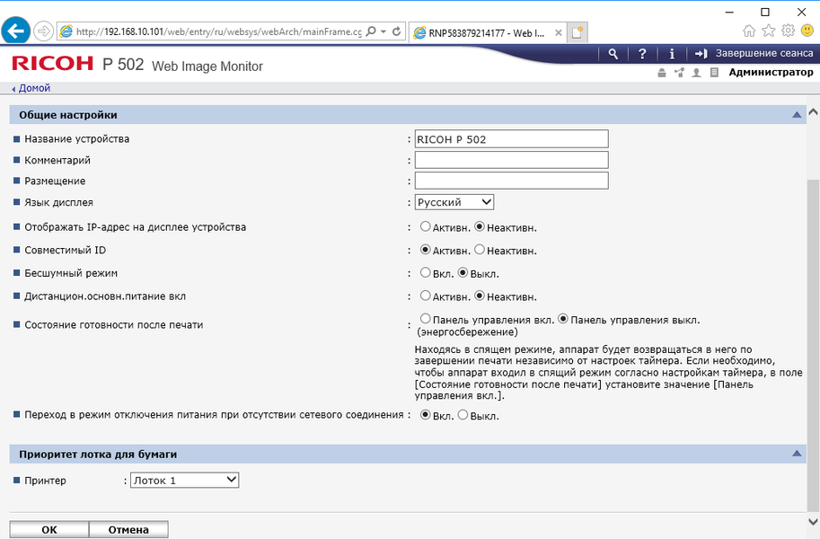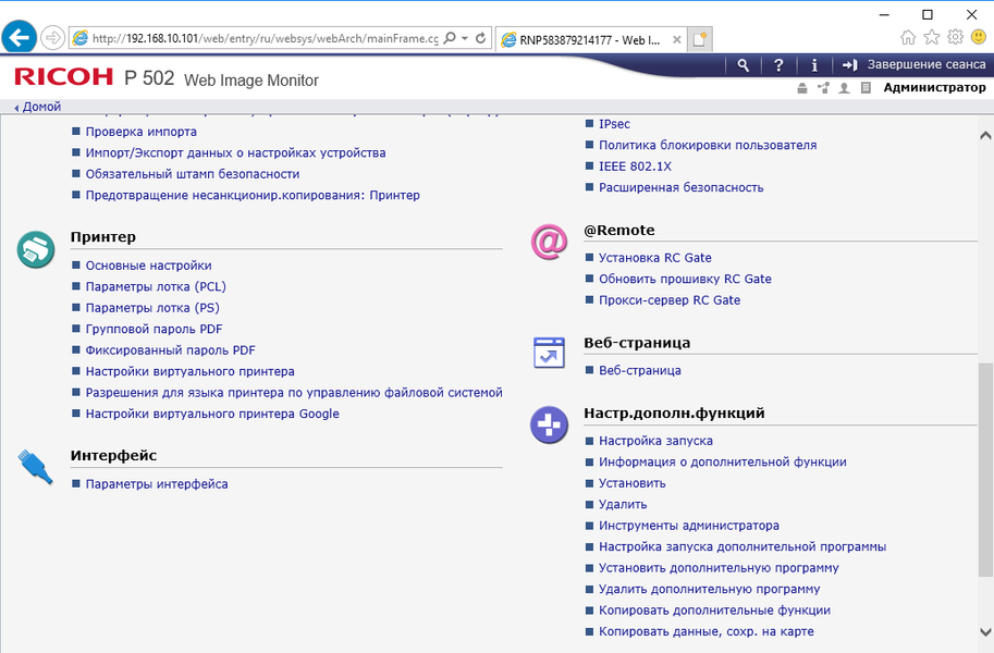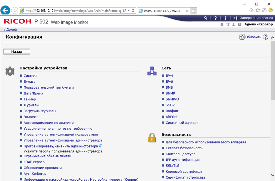 Меню является достаточно простым в освоении — не только опытный админ, но даже более-менее продвинутый пользователь вполне способен понять логику управления и добраться до нужной настройки без долгого изучения инструкций. Структура и логика как отображаемой на экране информации, так и меню настроек являются одинаковыми для многих новых принтеров Ricoh, что сокращает время на освоение пользователями и администраторами нескольких разных моделей.