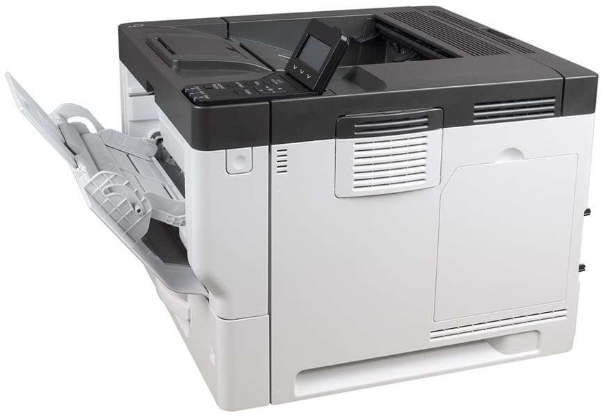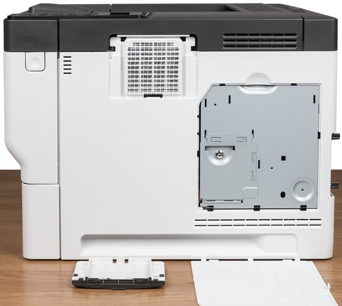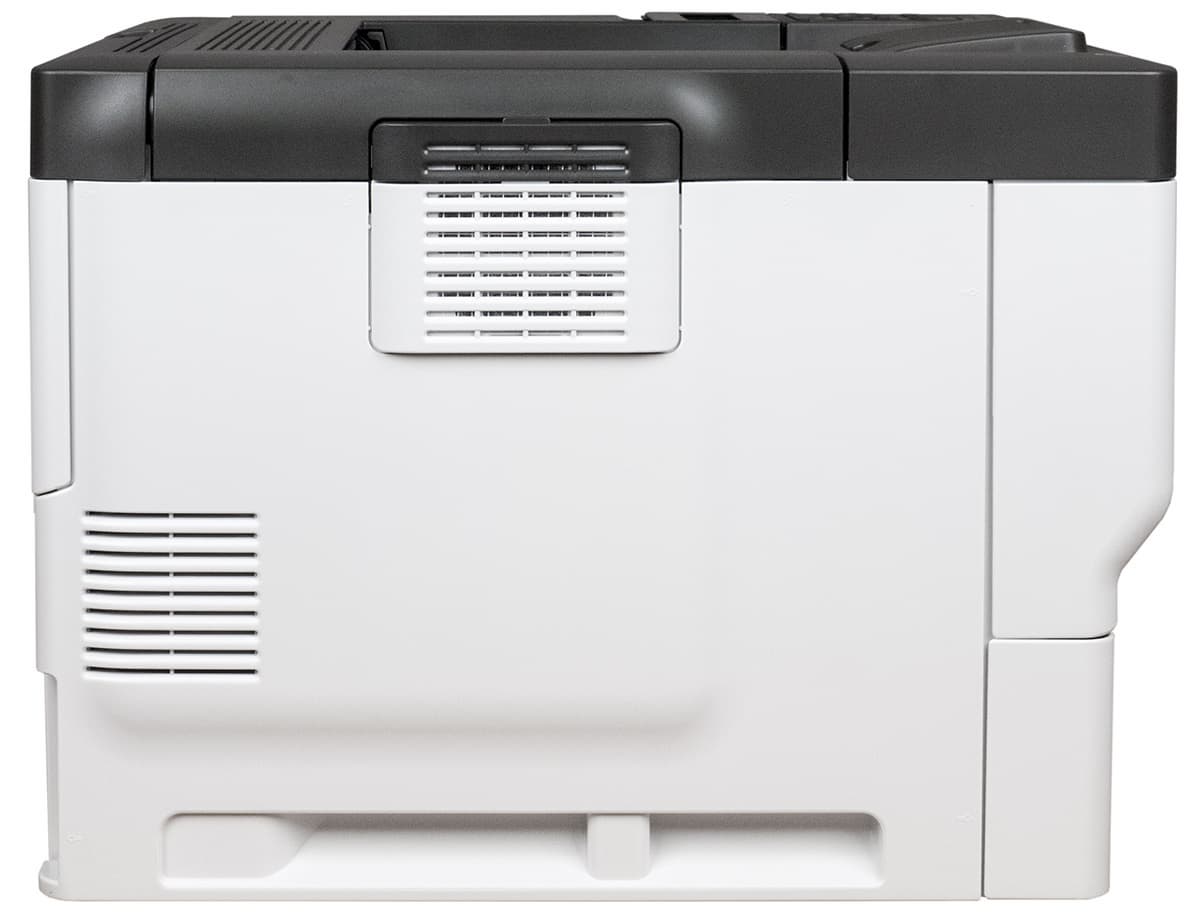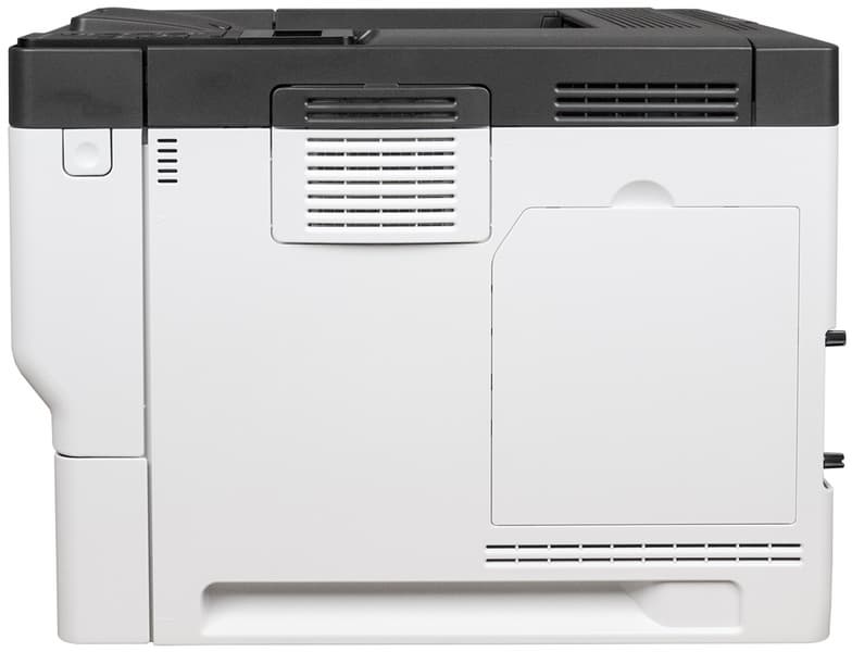 На боковых стенках выделяются небольшие съемные крышки с прорезями для вентиляции, за которыми находятся фильтры. В нижней части обеих боковин имеются выемки для захвата руками при переноске; инструкция рекомендует переносить принтер вдвоем, но его вес вполне позволяет делать это и одному человеку.