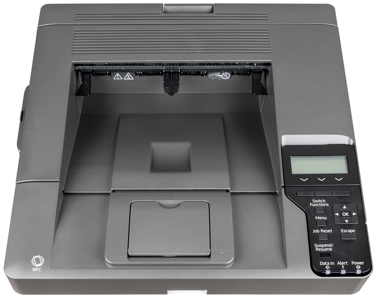 Значительную часть верхней плоскости принтера занимает ниша приемного лотка. Справа от него расположена панель управления с ЖК-экраном, слева, ближе к передней плоскости, отмечено положение метки NFC.
