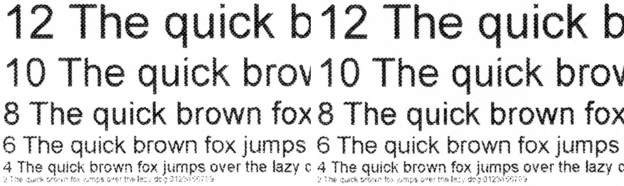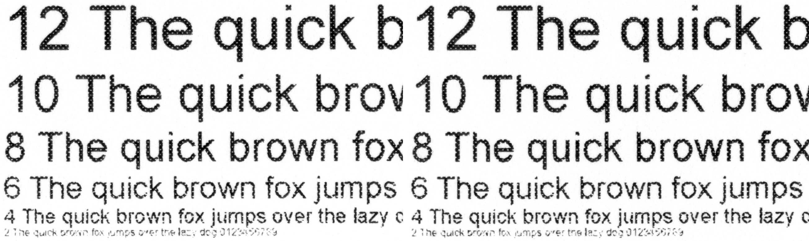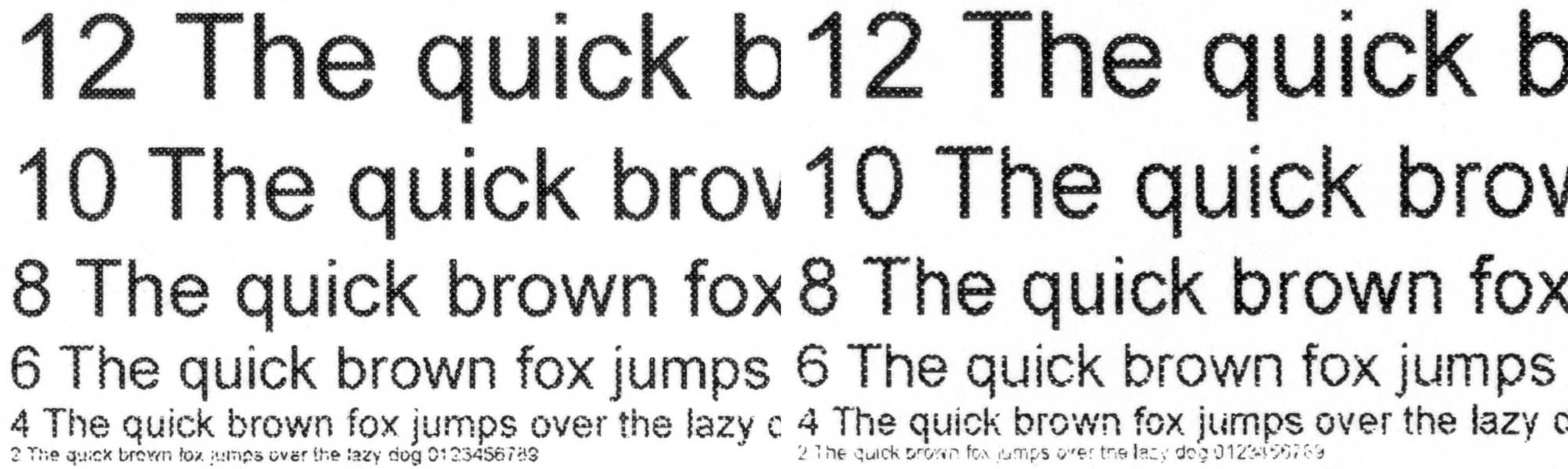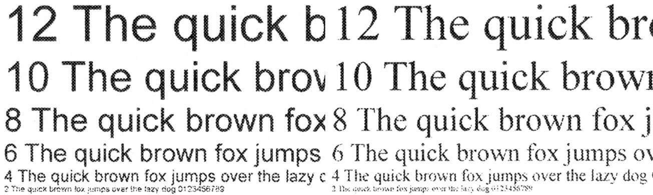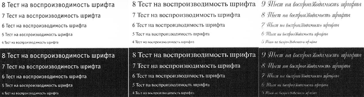 Читаемость нормальных шрифтов при всех установках качества начинается с 4-го кегля (у шрифтов с засечками этот кегль все же читается неуверенно), вывороткой — с 5-го. Декоративные шрифты становятся более-менее разборчивыми соответственно с 8-го и 9-го кеглей.