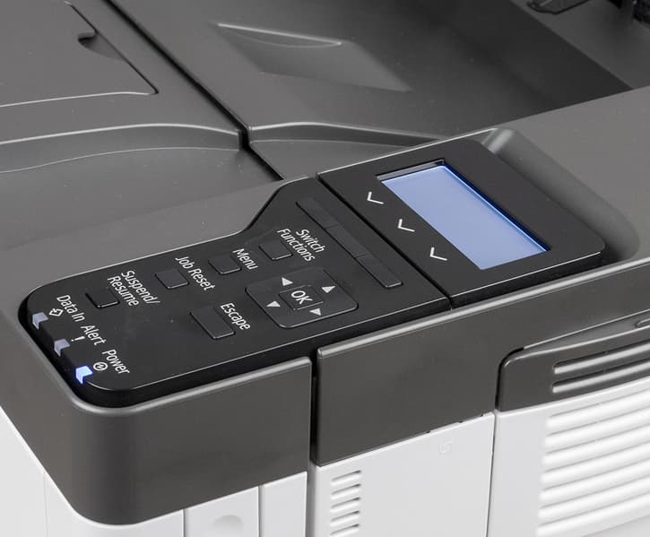 Индикаторы обычные для подобных принтеров: питания (синий, не горит в режиме энергосбережения), ошибки (красный/желтый) и ввода данных (синий).
