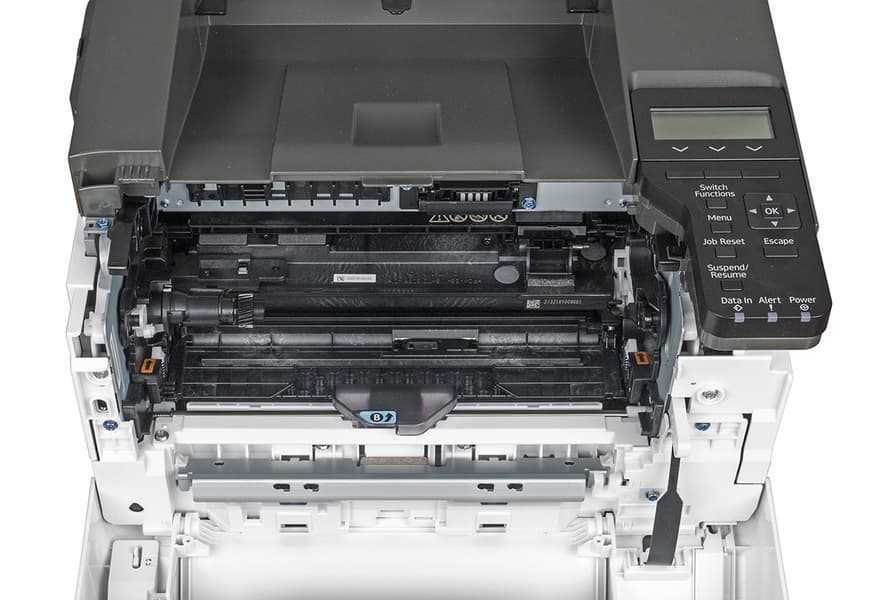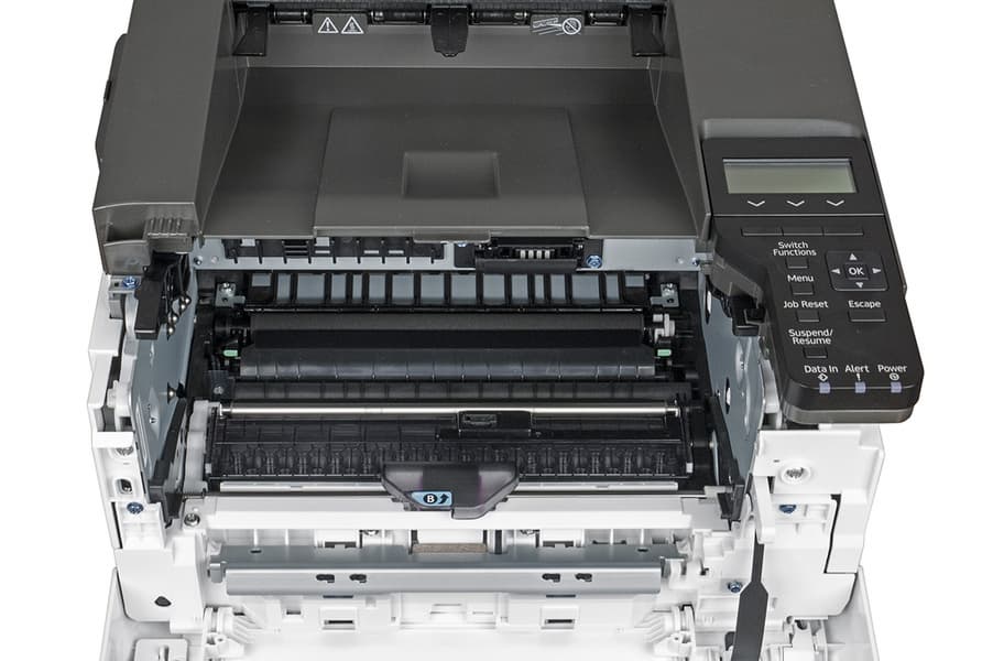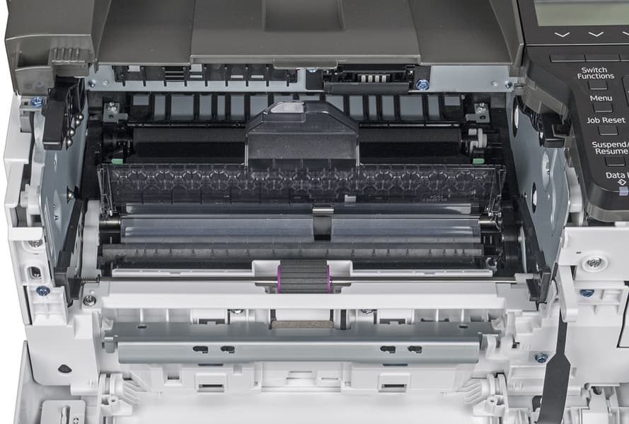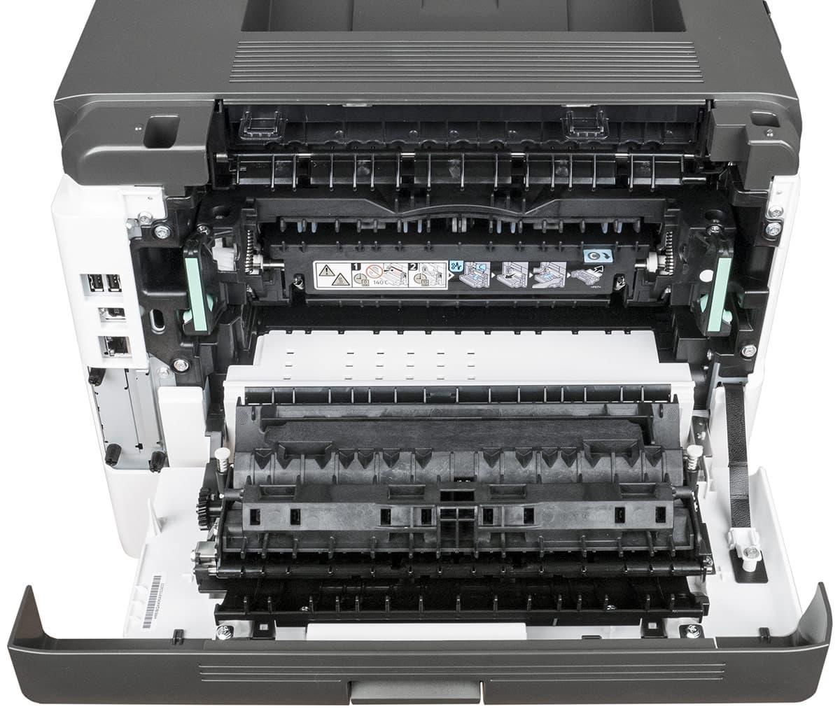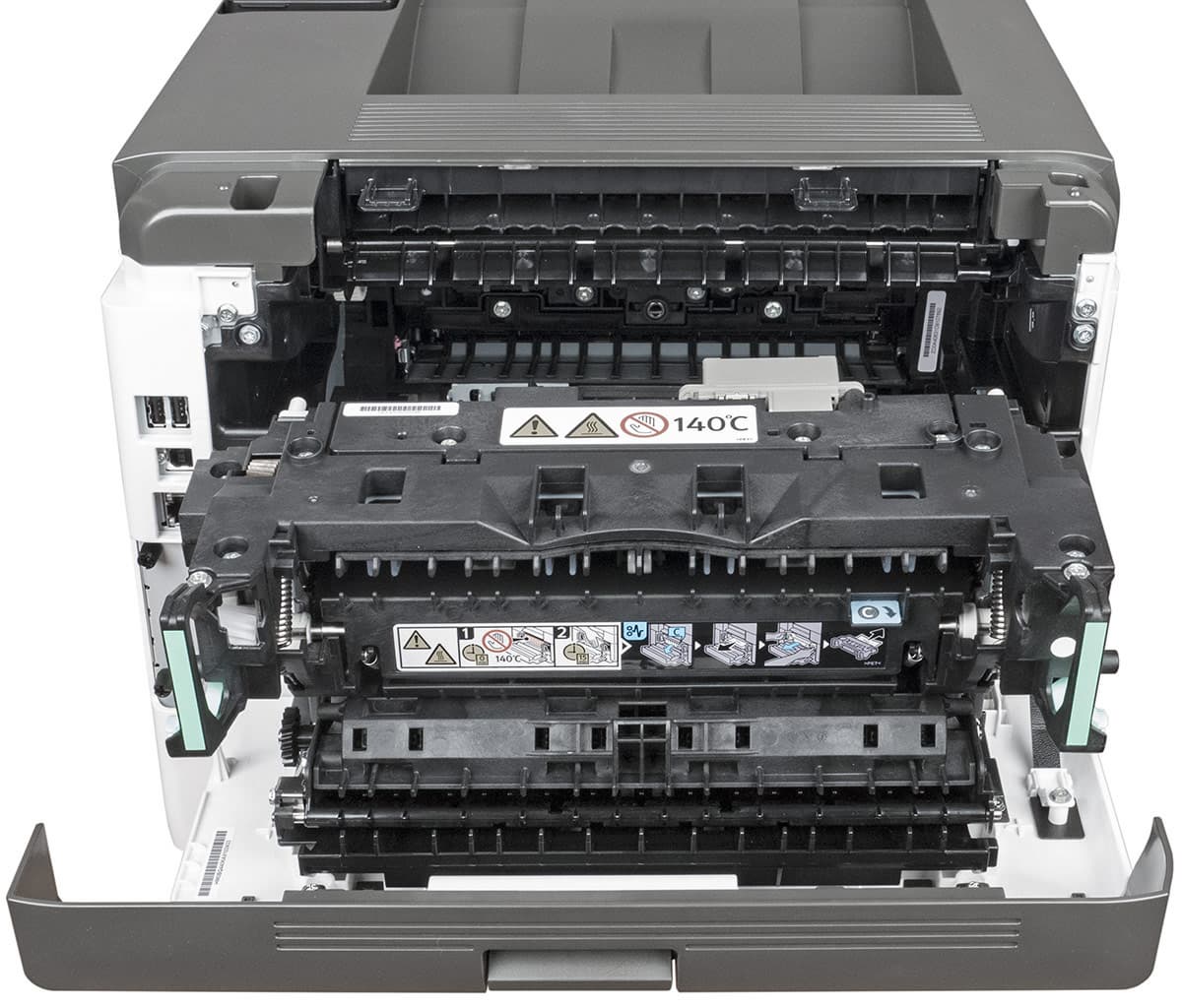 Сзади также имеется откидная крышка, за ней находится тракт прохождения бумаги и узел термозакрепления.
