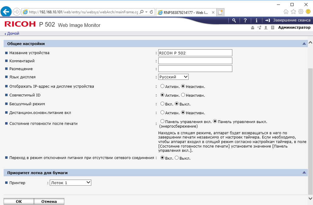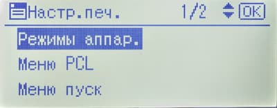 В процессе работы с меню существенных замечаний к его русификации у нас не появилось. Из мелочей упомянем разве что такую установку, как «немой режим» — обычно его называют тихим, что лучше передает назначение: снижение шумности за счет уменьшения скорости печати (именно такое название мы видели ранее и у другой печатающей техники Ricoh). Есть и другие примеры не самых корректных переводов или не очень удачных сокращений, но они особо не мешают правильному восприятию.