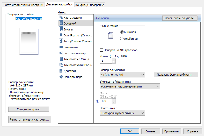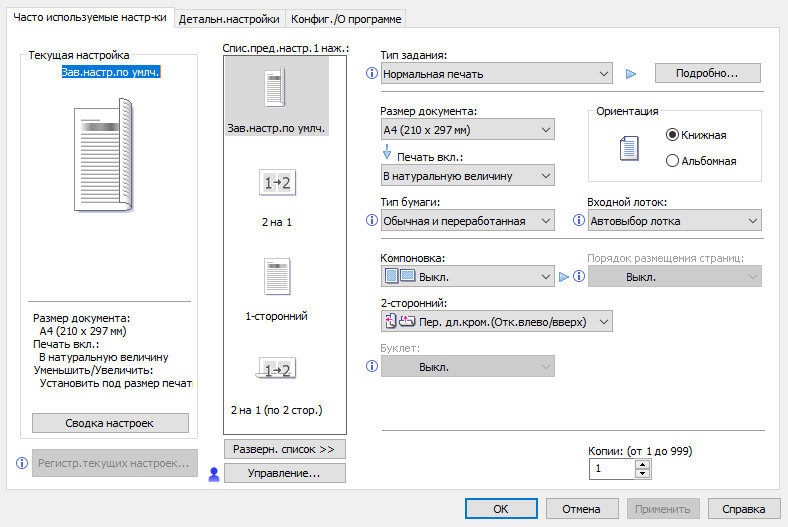 Имеется большой набор различных настроек, как обычных для подобного рода принтеров, так и специфических.