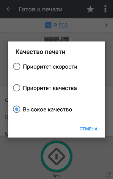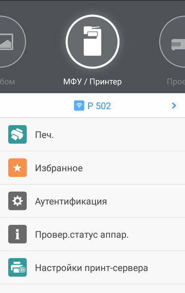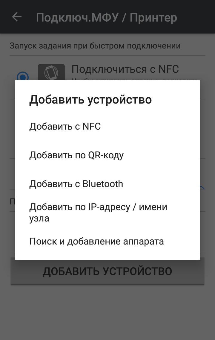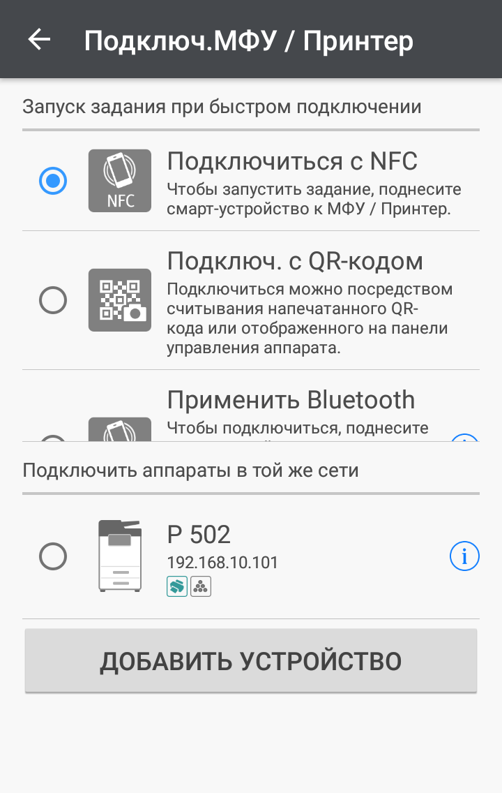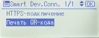 При использовании мобильного гаджета, не поддерживающего NFC, есть и другой вариант — с QR-кодом, который распечатывается на листе бумаги из меню принтера («Интерфейс хост-компьютера → Smart Device Connector → Печать QR-кода»).
