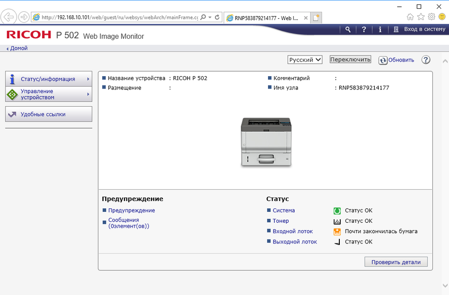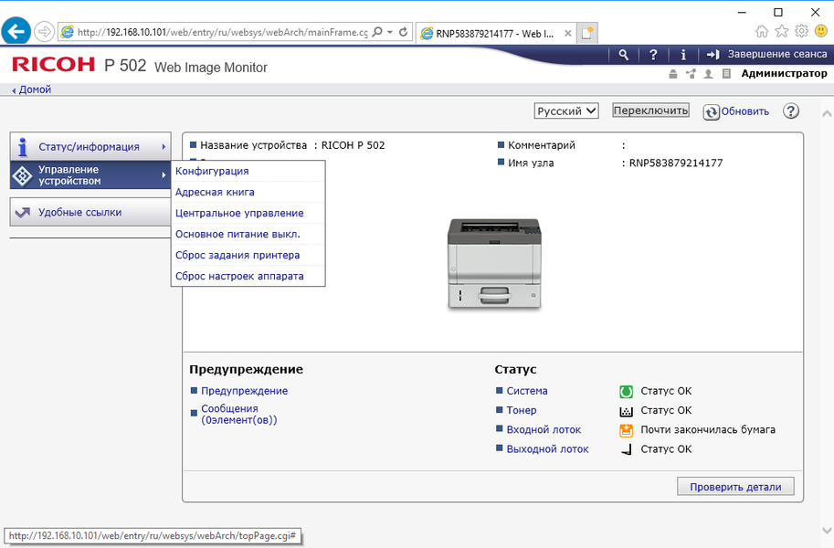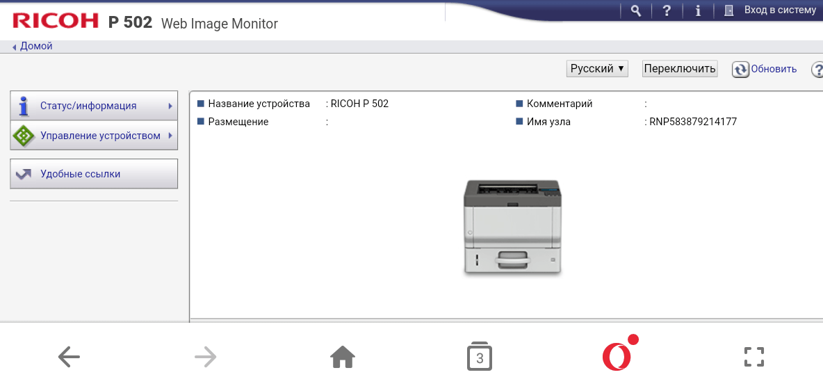 Расширенное управление принтером доступно с помощью уже знакомого нам интерфейса Web Image Monitor, который вызывается в окне браузера мобильного устройства.
