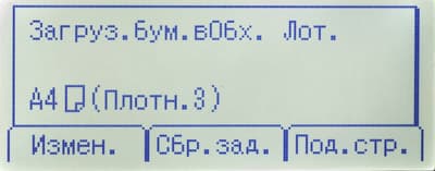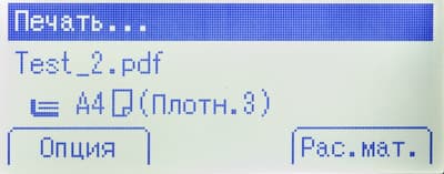Во время печати в средней части экрана отображаются наименование выводимого на печать файла, выбранный лоток, формат и тип бумаги (если он отличен от «обычная») в нем. В режиме энергосбережения на дисплее появляется соответствующая надпись, при открытых крышках тоже.