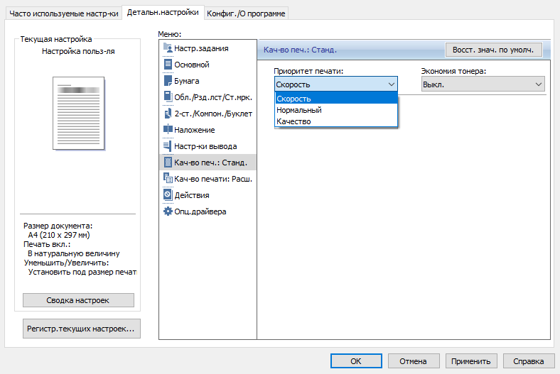 Смена приоритетов и включение режима экономии тонера наблюдаемых изменений не вносит.