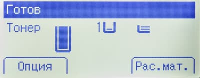 Исходная страница или страница режима готовности отображает состояние основных расходных материалов в виде иконок. Иконки мелкие, но довольно наглядные, они в графическом виде показывают остаток тонера, а также бумаги в каждом лотке (вероятно, при наличии опциональных лотков иконок станет больше, по числу лотков, поэтому их размер и выбран не очень крупным).