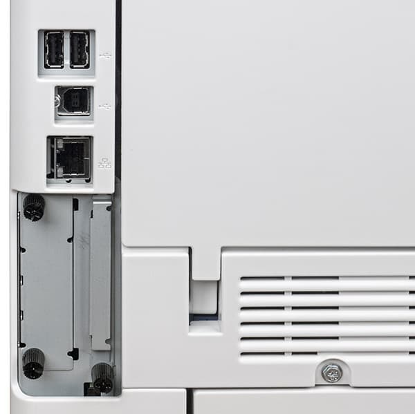 Интерфейсные разъемы (USB type B для подключения к компьютеру, сетевой Ethernet и два USB type A, предназначенные для внешних устройств — например, устройства идентификации карт) находятся на задней стенке справа, ниже расположены слоты для установки опциональных модулей, включая адаптер Wi-Fi. Гнездо для кабеля питания также сзади, но с другой стороны — возле левой стенки.