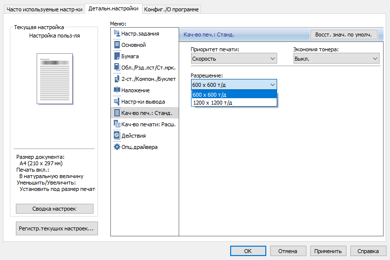 Найти хоть какие-то отличия при смене разрешения можно только при непосредственном сравнении и с сильной лупой, скорость печати тоже не меняется, и с высокой вероятностью можно сделать вывод, что физическим разрешением печати является именно 600×600 dpi.