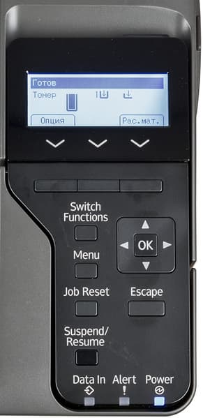Для навигации по меню используется пятикнопочный блок со стрелками влево-вправо, вверх-вниз и центральной кнопкой ОК (на наш взгляд, это привычнее и удобнее, чем четыре кнопки со стрелками и вынесенная отдельно ОК, как в некоторых других новых моделях Ricoh). Еще пять кнопок управляют режимами и настройками, в том числе вызывают меню, приостанавливают-возобновляют и отменяют текущее задание.