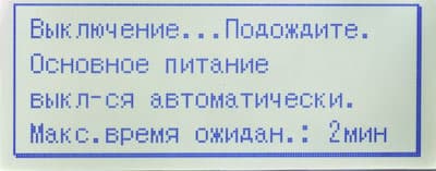После нажатия кнопки Power для выключения принтера появляется сообщение о том, что время ожидания может составлять до 2 минут. При USB-подключении обычно у нас все происходило гораздо быстрее: питание отключалось всего за 6-8 секунд, но иногда приходилось ждать до минуты. При сетевом варианте наоборот: чаще процесс выключения длился около минуты, но порой все заканчивалось быстрее.