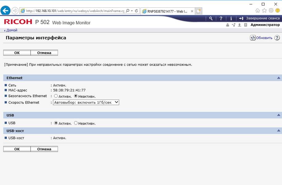 Затем предлагается задать основные настройки: дату и время, а также параметры интерфейсов. В штатной поставке их два — проводной сетевой (по умолчанию для получения параметров используется DHCP) и USB (если планируется использовать локальное подключение, то сначала непременно надо активировать USB-порт, который по умолчанию выключен).