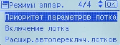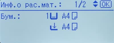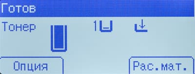 Исходная страница (или страница режима готовности) отображает состояние основных расходных материалов в виде иконок. Иконки мелкие, но довольно наглядные, они в графическом виде показывают остаток тонера, а также бумаги в каждом лотке (вероятно, при наличии опциональных лотков иконок станет больше, по числу лотков, поэтому их размер и выбран не очень крупным).