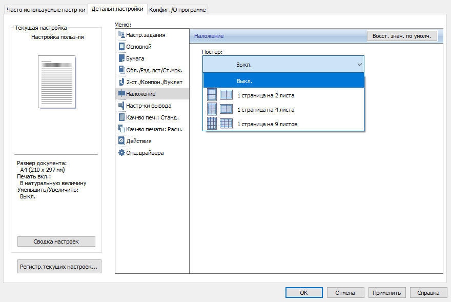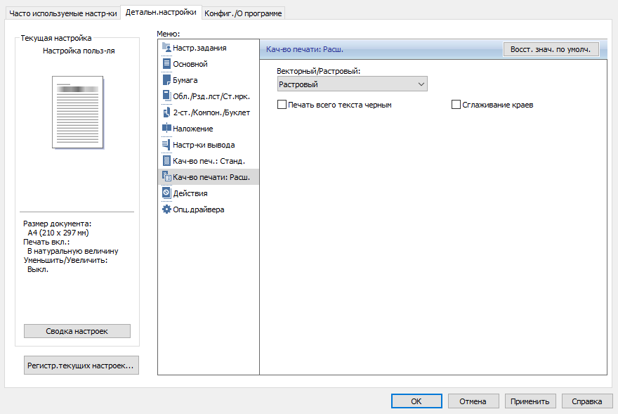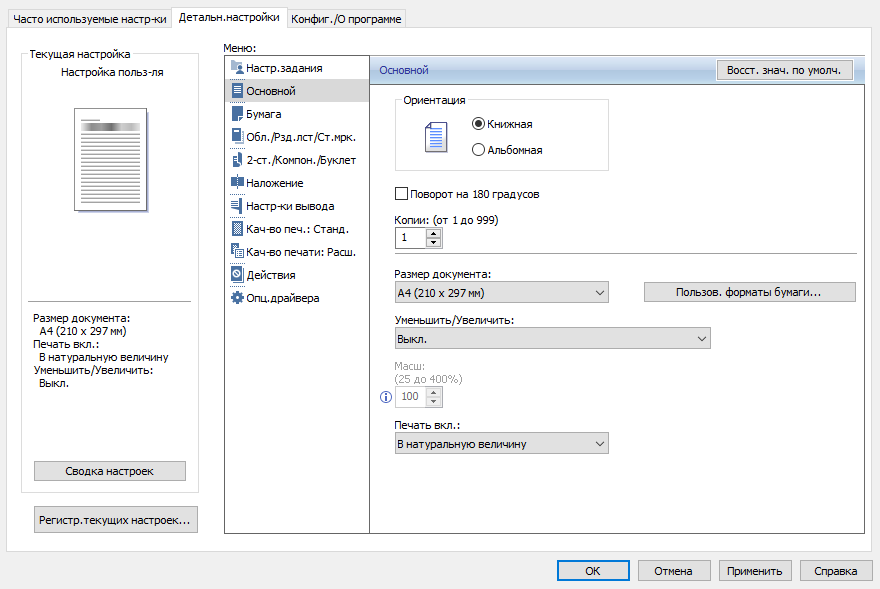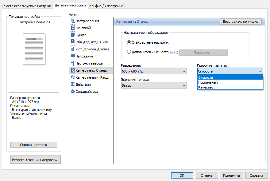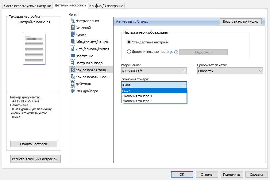 Имеется большой набор различных настроек, как обычных для подобного рода принтеров, так и специфических.
