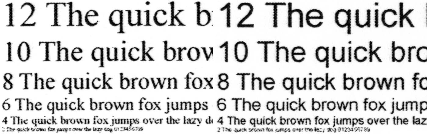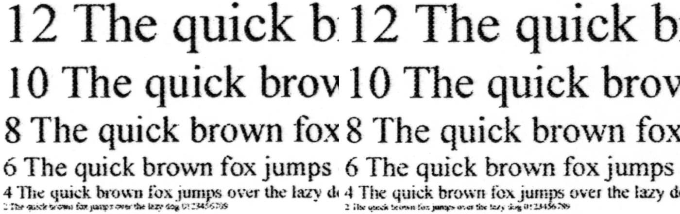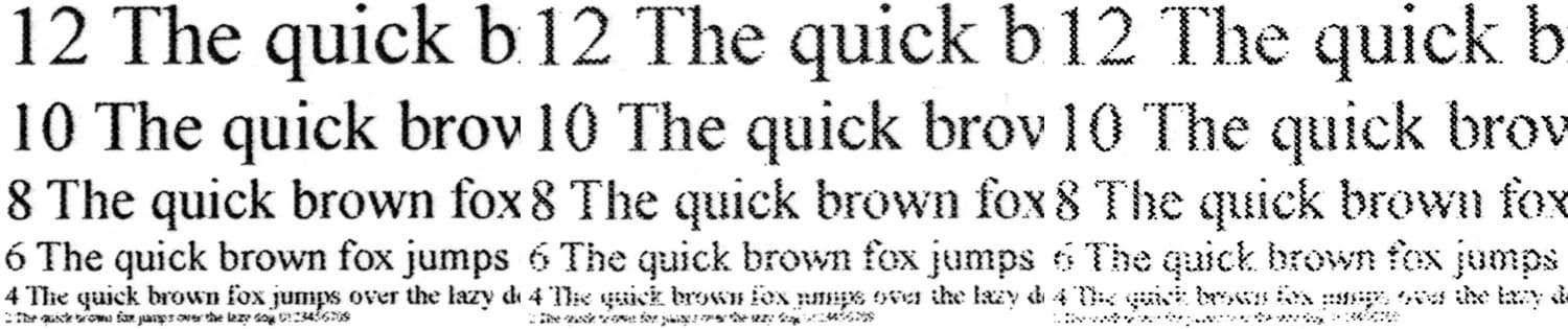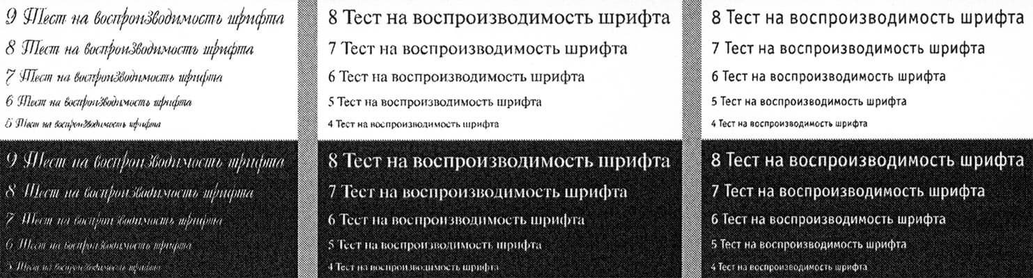 Читаемость нормальных шрифтов при всех установках качества начинается с 4 кегля, вывороткой — с 5-го (у шрифтов с засечками этот кегль все же читается неуверенно). Декоративные шрифты становятся более-менее разборчивыми соответственно с 7-го и 9-го кеглей.