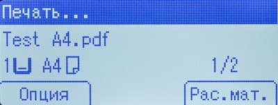 Во время печати в средней части экрана отображаются наименование выводимого на печать файла, выбранный лоток и формат/тип бумаги в нем.