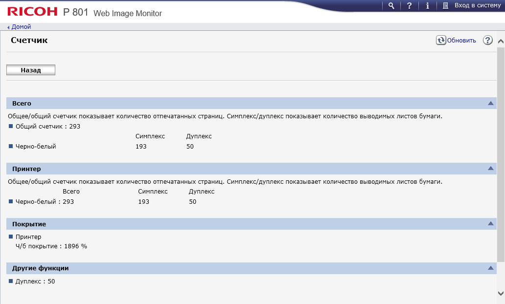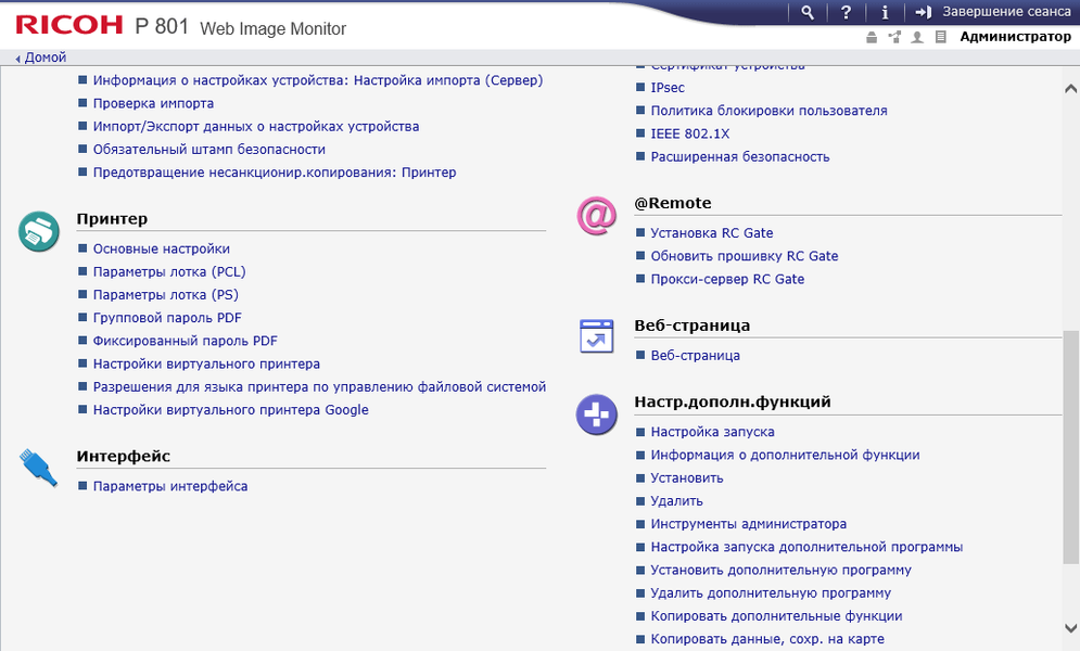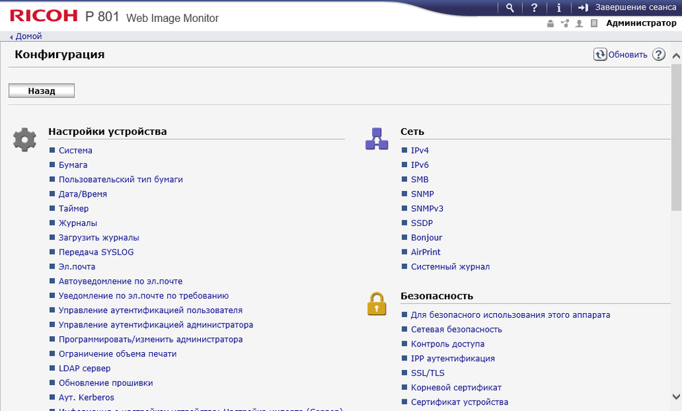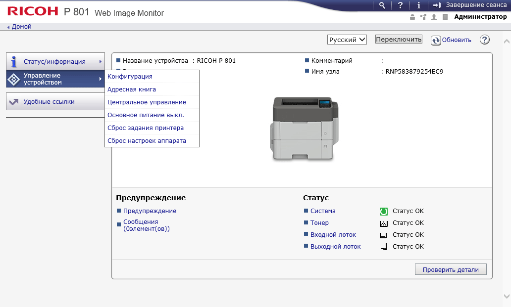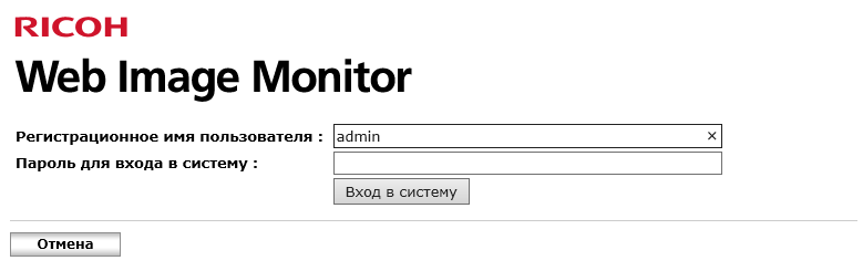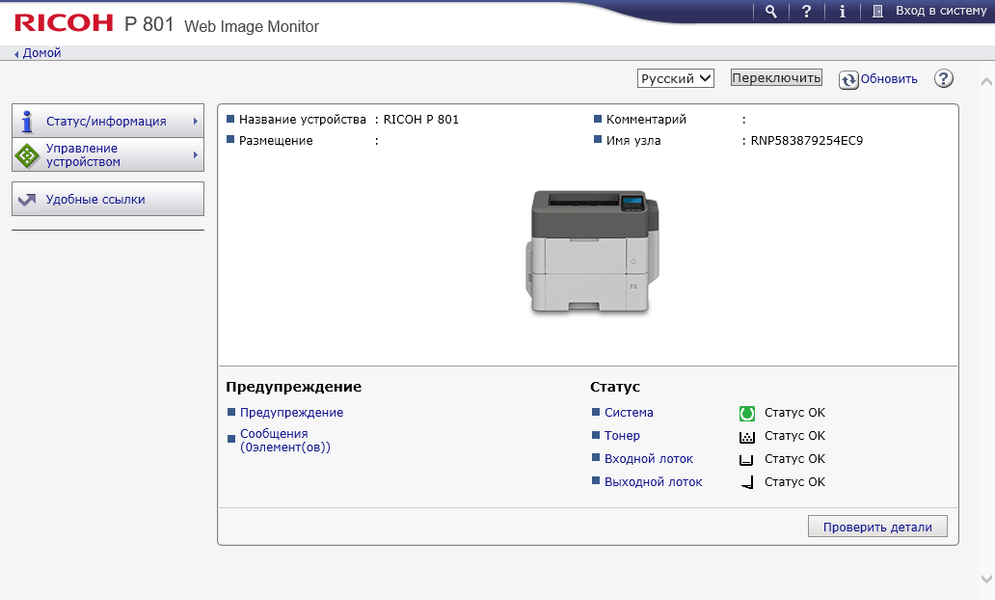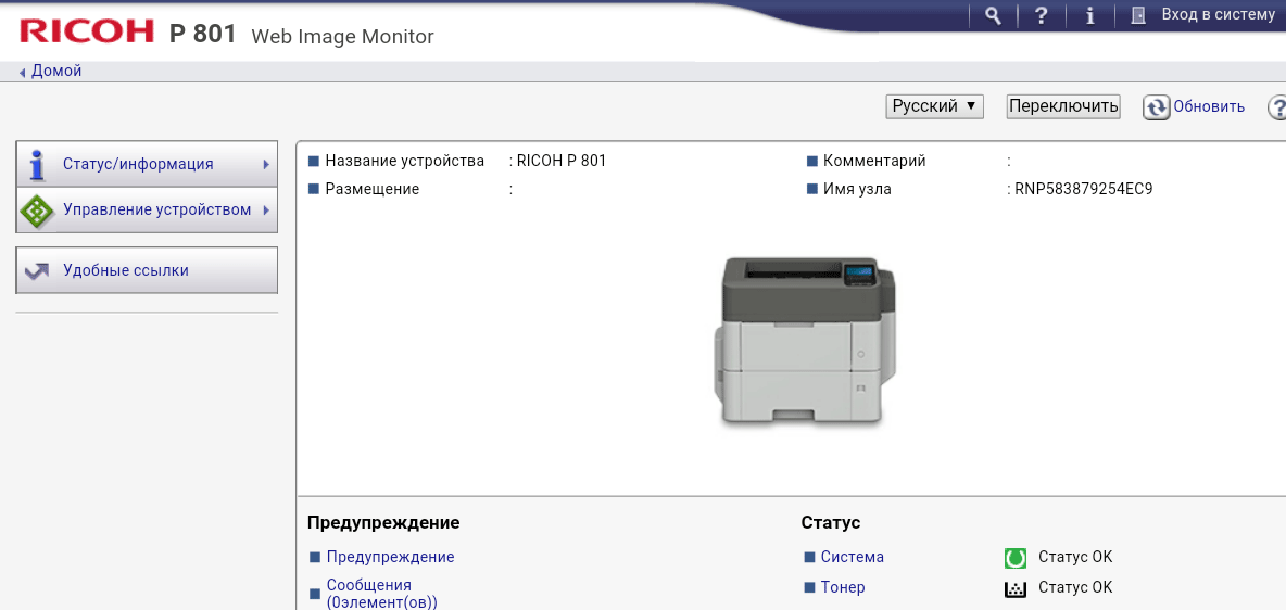 Расширенное управление принтером доступно с помощью уже знакомого нам интерфейса Web Image Monitor, который вызывается в окне браузера мобильного устройства.