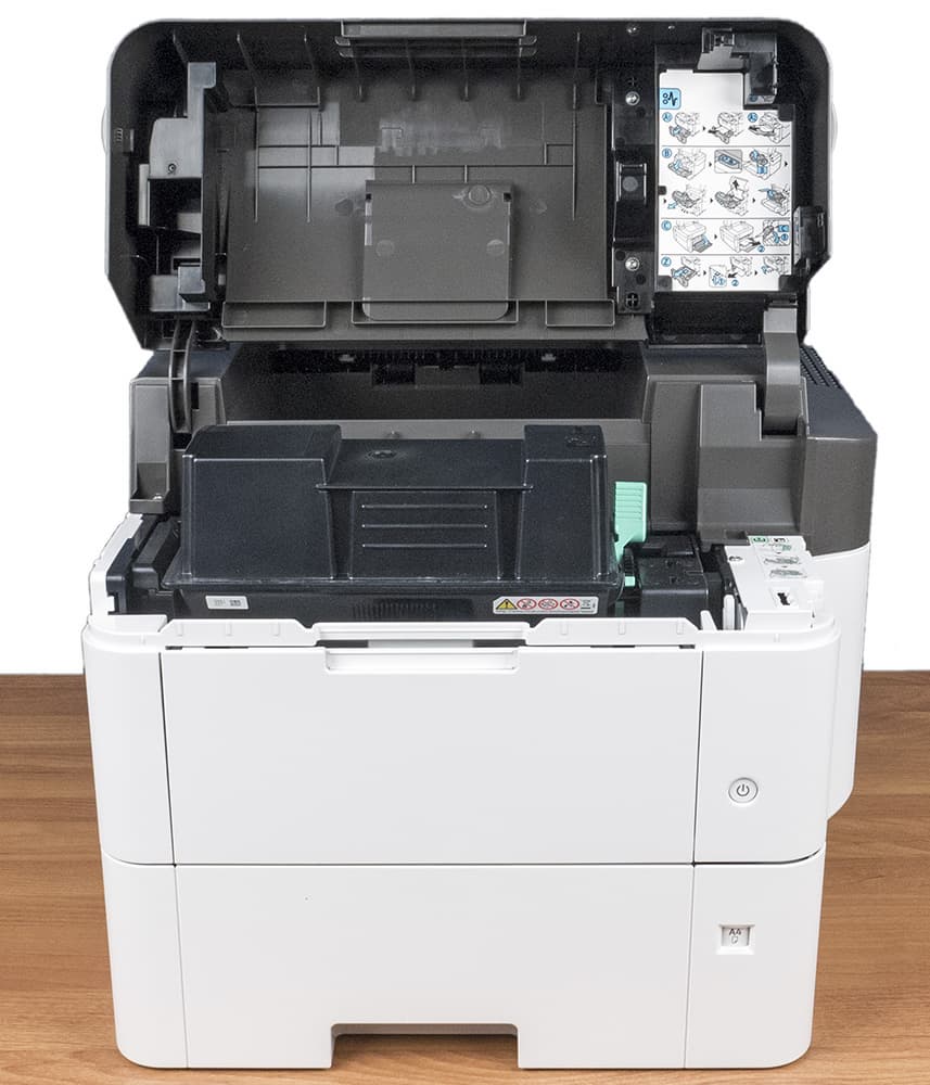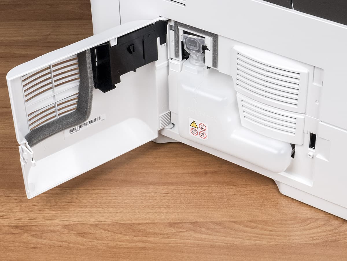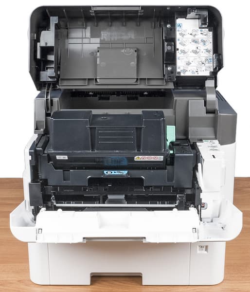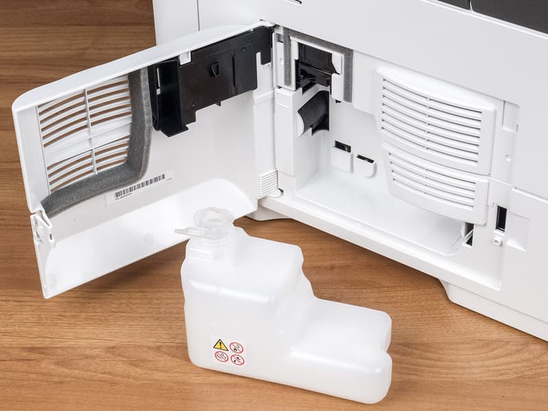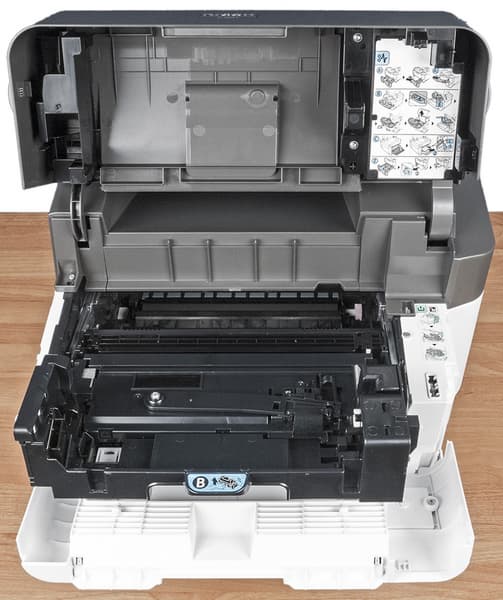 Подготовка к работе не составляет труда, действия описаны в прилагаемой бумажной инструкции по быстрой установке. Из непривычного упомянем необходимость установки бункера для отработанного тонера, который обычно устанавливается на заводе, а здесь его должен поставить на место владелец — возможно, для того, чтобы показать простоту этой процедуры.
