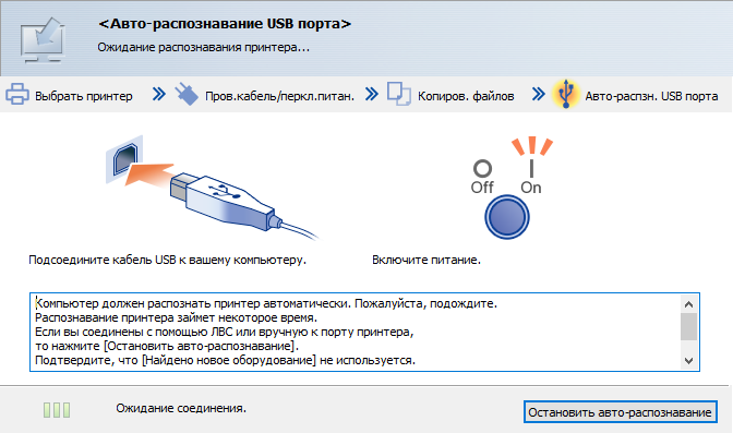 После первого включения питания можно выбрать язык меню (русский также доступен), в это время происходит первоначальная подкачка тонера, занимающая чуть менее 5 минут.