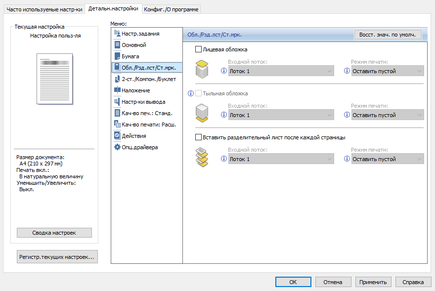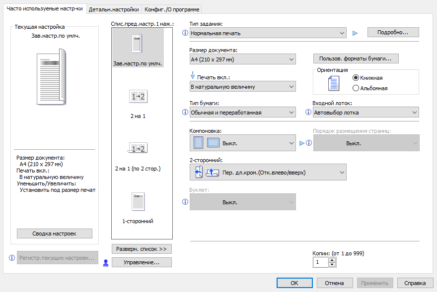 Тем не менее, в настройках драйвера попросту невозможно одновременно задать лоток 1 и конверт, поэтому для опробования печати на таком носителе мы пользовались обходным лотком.