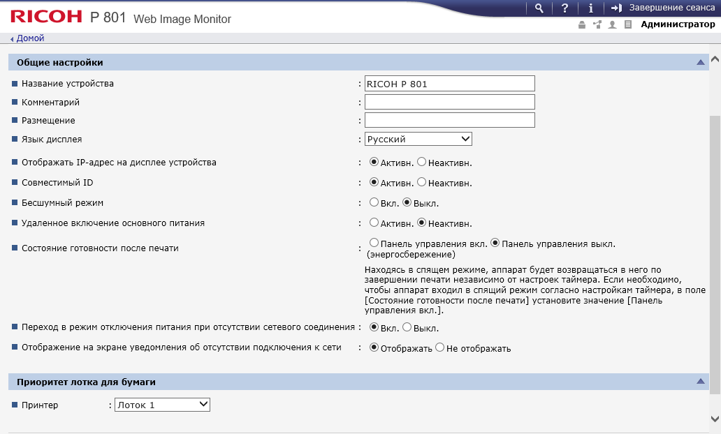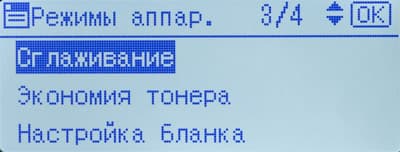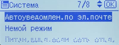 В процессе работы с меню существенных замечаний к его русификации у нас не появилось. Из мелочей упомянем разве что такую установку, как «немой режим» — обычно его называют тихим, что лучше передает назначение: снижение шумности за счет уменьшения скорости печати (именно такое название мы видели и у другой печатающей техники Ricoh). Есть и другие примеры не самых корректных переводов или не очень удачных сокращений, но они особо не мешают правильному восприятию.