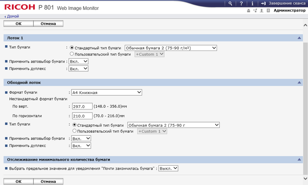 | Стандартные лотки, вместимость при 80 г/м² | подающие: выдвижной 500 листов, обходной 100 листов приемный: 500 листов |