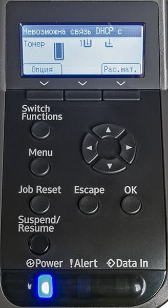 Индикаторы обычные для подобных принтеров: питания (синий, не горит в режиме энергосбережения), ошибки (красный/желтый) и ввода данных (синий).