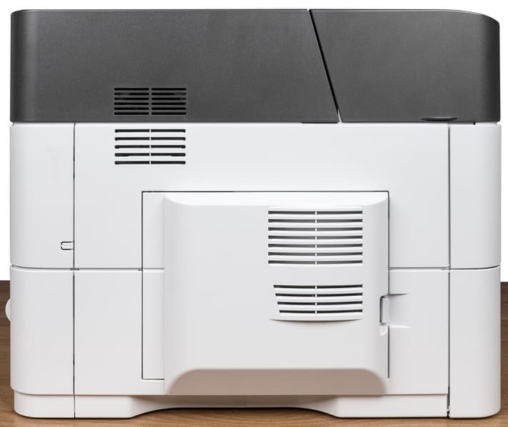 Ближе к правому боку на задней стенке расположены разъемы: внизу для кабеля питания, выше — интерфейсные Ethernet, USB type B, а также два USB type A, предназначенные для внешних устройств (например, устройства идентификации карт).